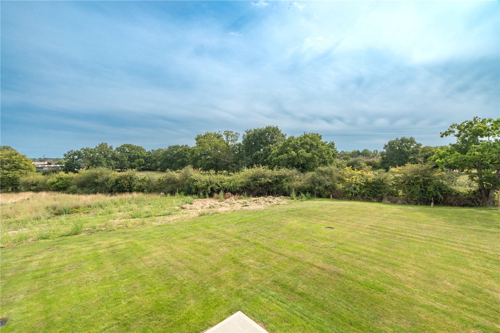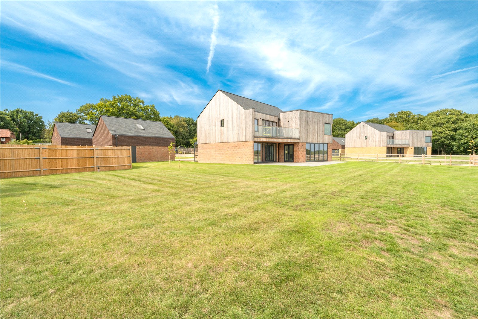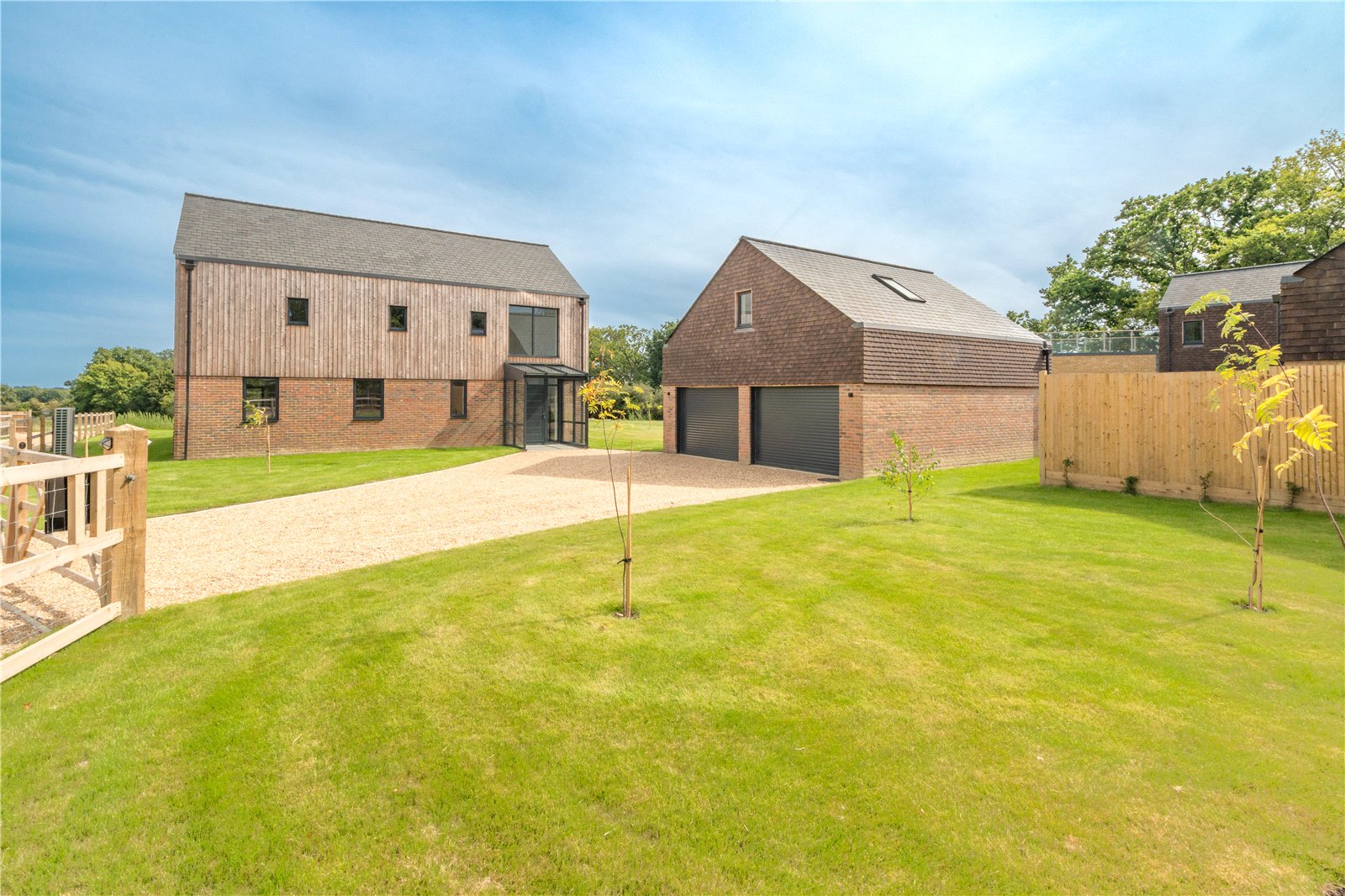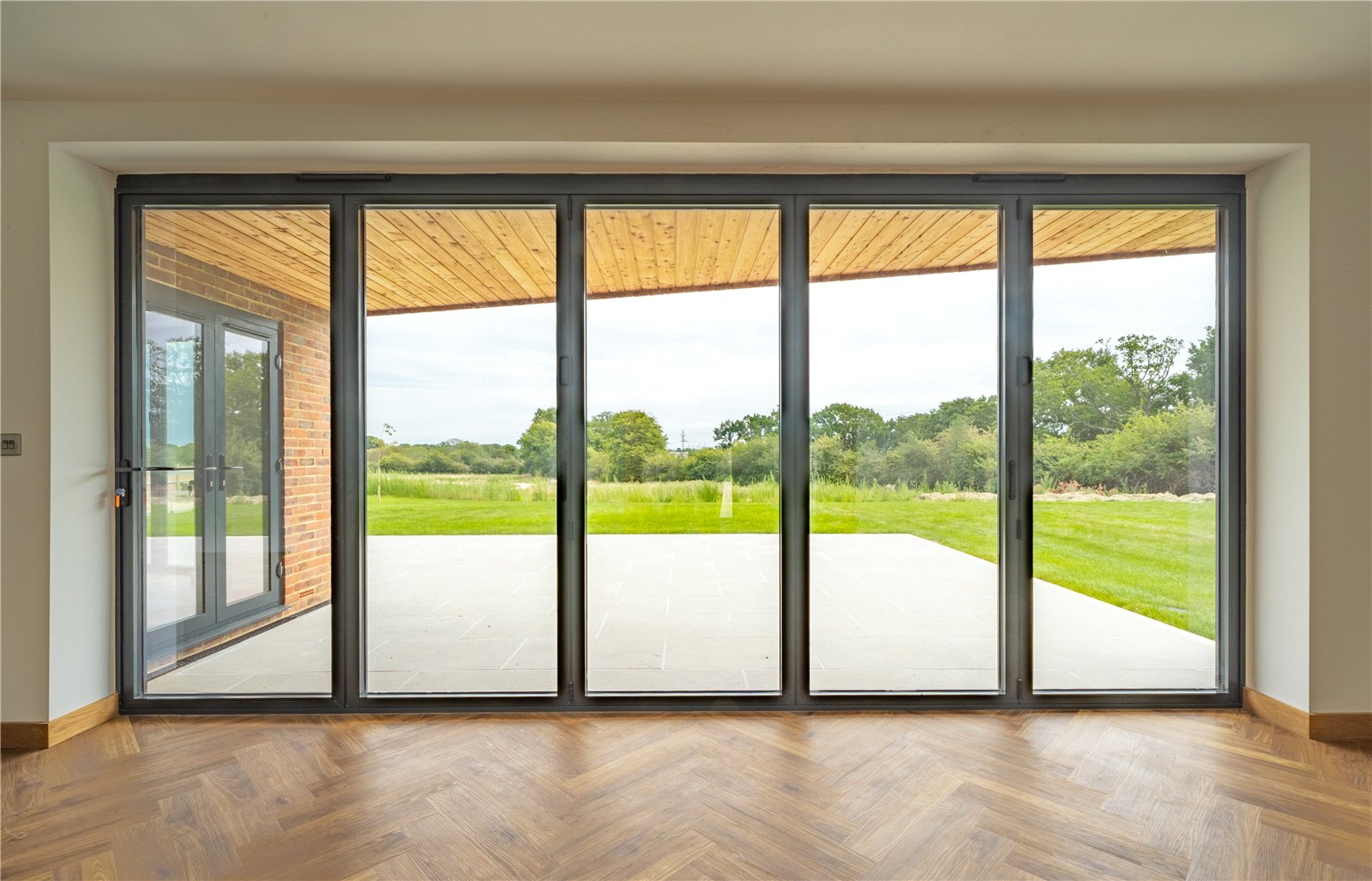 To the rear, full-height glazing opens directly onto a generous stone terrace, ideal for entertaining and outdoor dining, while the large level lawn beyond enjoys a delightful open outlook across neighbouring countryside. The garden is securely enclosed with post-and-rail and close-board fencing, offering both privacy and security, making it perfectly suited for families.