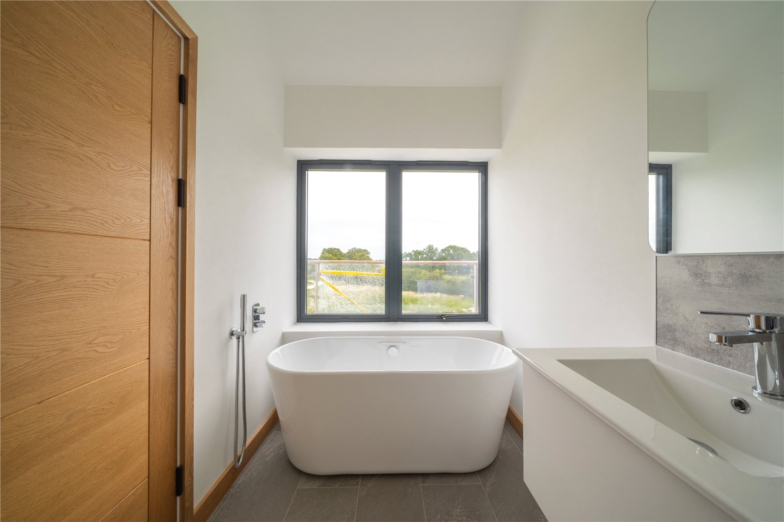 EN-SUITE: The luxurious en-suite is fitted with a freestanding bathtub set beneath a wide picture window, a sleek vanity unit with inset basin, a WC, and contemporary tiling, combining spa-like elegance with everyday practicality.
