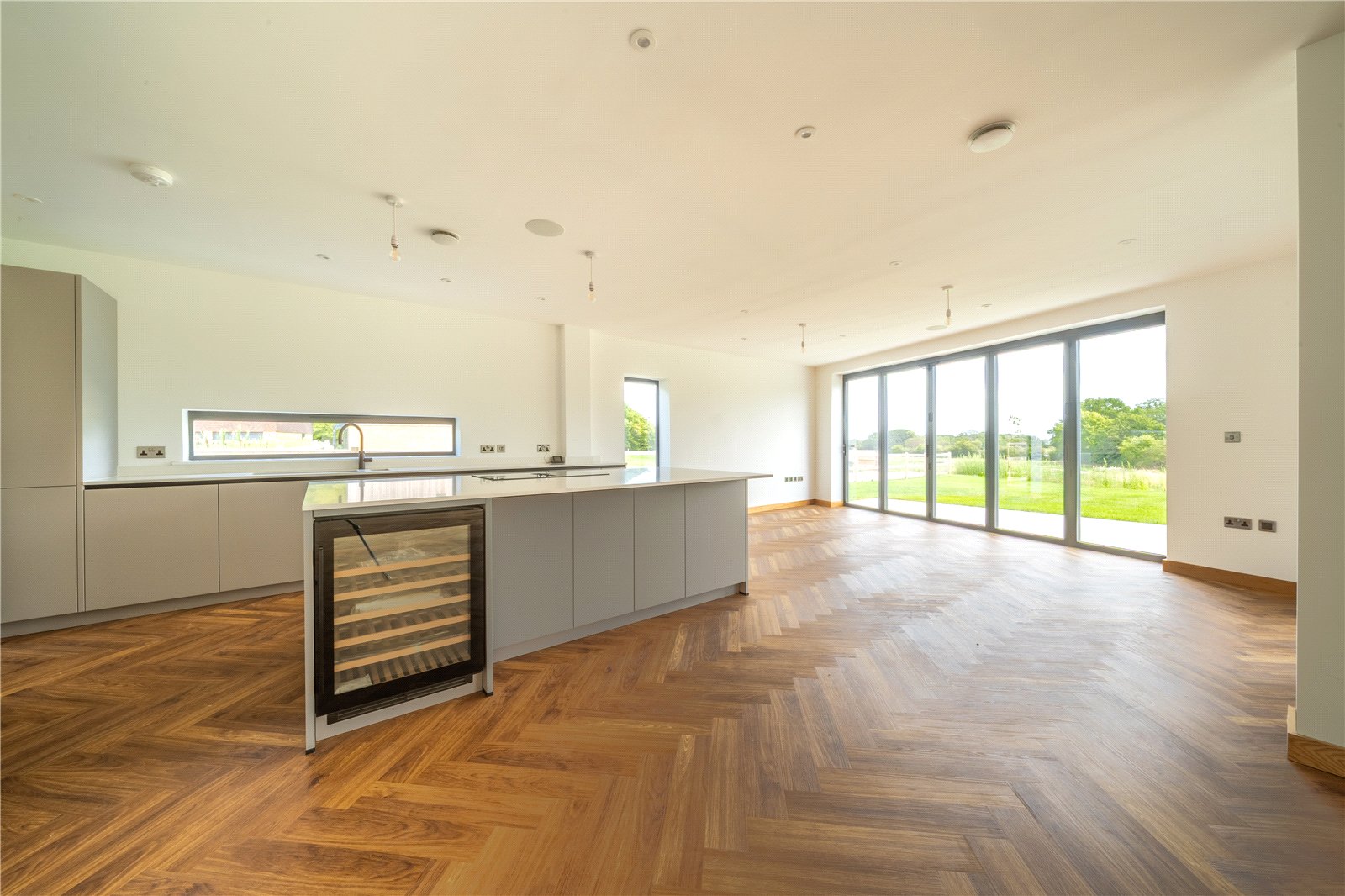 The kitchen is sleek and contemporary, fitted with a range of streamlined units, high-quality integrated appliances, and a central island with breakfast bar seating, complemented by a built-in wine cooler. A distinctive herringbone-patterned wood floor runs throughout, enhancing the sense of style and continuity, while the generous proportions of the room allow for defined living, dining, and entertaining areas.