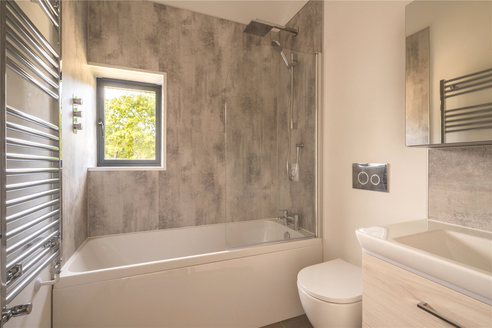 FAMILY BATHROOM: Finished to a high specification, the family bathroom combines style with practicality. It features a modern three-piece suite comprising a panelled bath with overhead rainfall shower and glass screen, a wall-hung WC, and a contemporary vanity unit with inset basin and storage beneath. Sleek chrome fittings, including a heated towel rail, complement the textured wall tiling, while a large window provides natural light and ventilation. A smart and elegant space, designed for everyday family use.