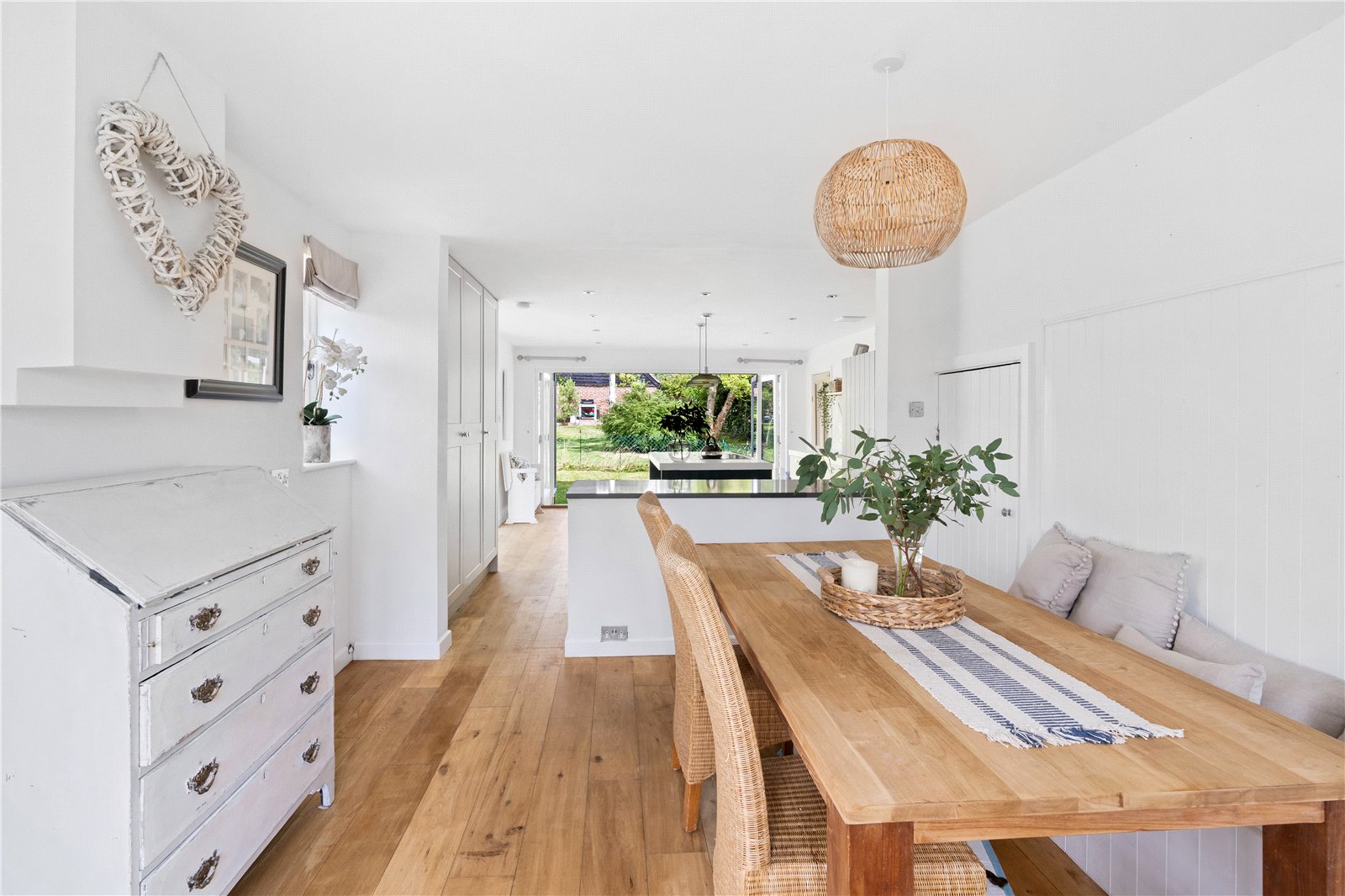 OPEN PLAN DINING ROOM: With a continuation of the attractive oak floors, being also a double aspect room with aspect over the side garden and front garden with views beyond to the South Downs, radiator, ceiling light, door to deep storage cupboard. Further door leading to front hall.