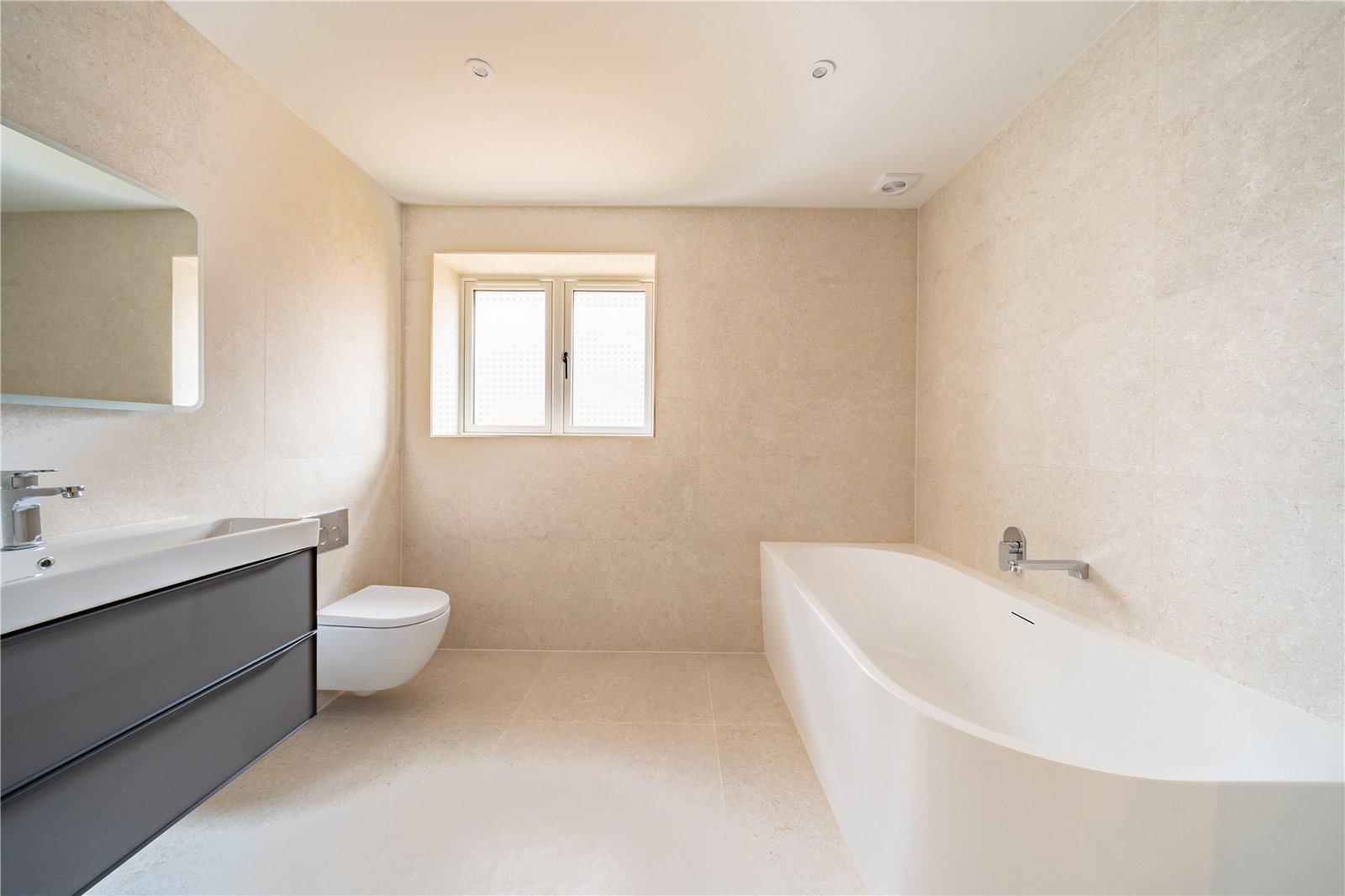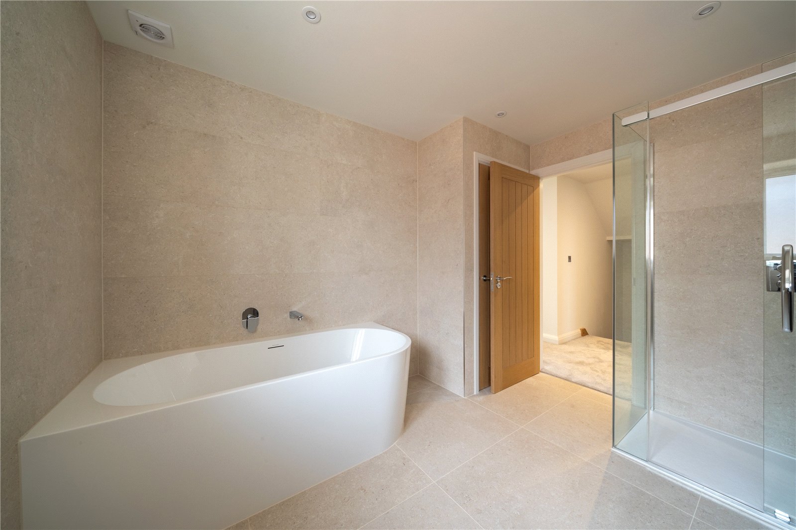 LUXURY FAMILY BATHROOM / SHOWER ROOM: Comprising of fully tiled floors and walls, large feature bath with chrome mixer tap, WC, with concealed cistern, was basin with chrome mixer tap, vanity storage under, wall mounted touch control light mirrors, separate double sized heavy glazed fronted shower with fully tiled walls, chrome shower control, heated chrome towel rail, underfloor heating, extractor fan down lighting, triple glazed frosted windows.