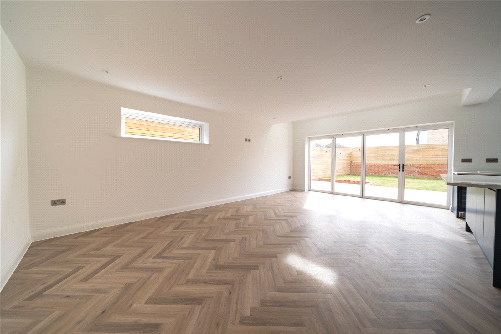 OPEN PLAN DINING ROOM: Comprising of the continuation of the Karndean herringbone wood effect flooring with underfloor heating, downlighting, triple glazed bi folding doors opening to the south side to the rear sun terrace, wall mounted points for a flat screen tv, wall plug sockets with android and apple phone charging points, triple glazed side window.