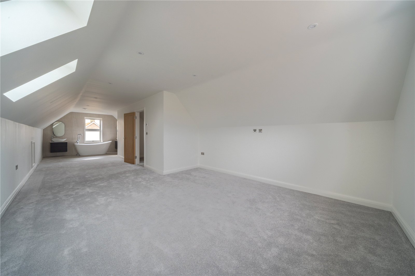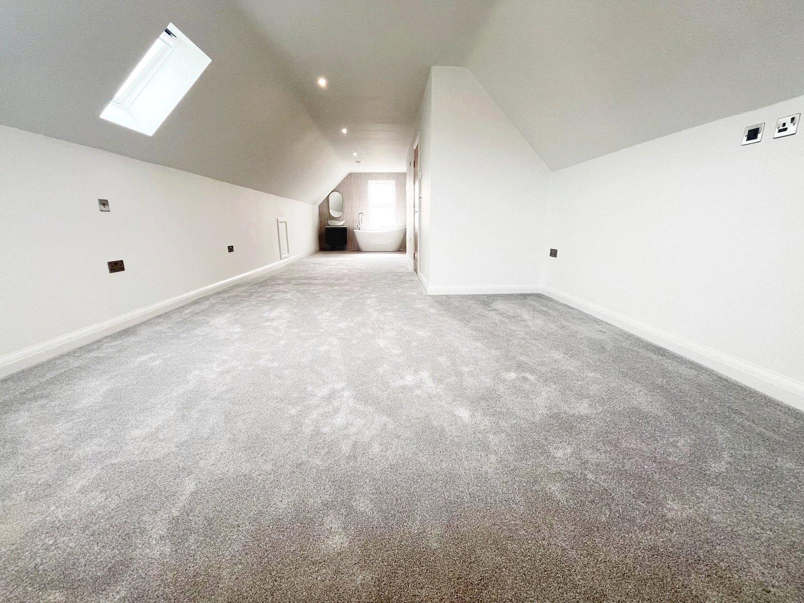 BEDROOM ONE MAIN PRINCIPAL SUITE WITH LARGE ENSUITE LUXURY BATHROOM / SHOWER ROOM: Comprising of a large triple aspect room with carpeted floors, underfloor heating, eaves storage cupboards, spaces to fit additional wardrobe cupboards, downlighting, wall mounting and electrical points for flat screen tv, triple glazed windows with far reaching rural views to the front and further triple glazed windows with aspect to rural views to the side, open plan adjoining luxury bathroom / shower room.