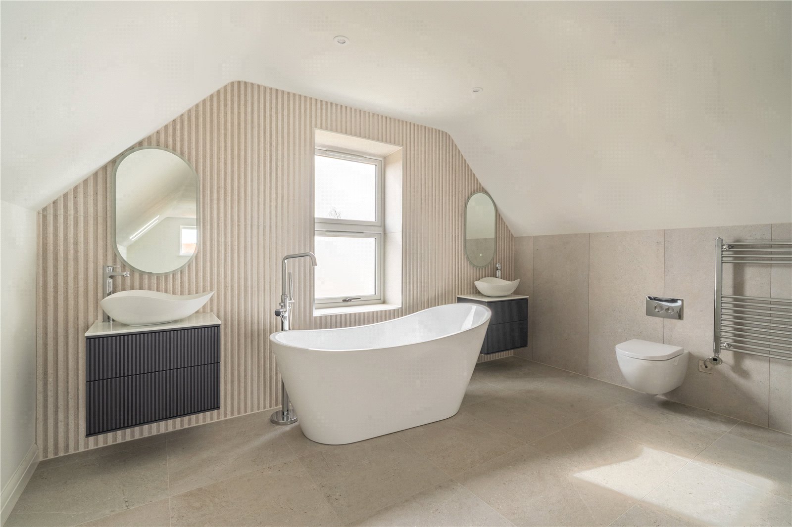 OPEN PLAN LUXURY ENSUITE BATHROOM / SHOWER ROOM: (easily able to have a diving wall incorporated if required in the future), tiled floors, tiled walls, underfloor heating, feature bath with chrome mixer taps, twin feature wash basins chrome mixer taps, vanity storage under, matching wall mirrors with touch light points, WC with concealed cistern and chrome flush points, chrome radiator / heated towel rail, separate double shower with fully tiled walls, chrome controls, triple glazed frosted window.