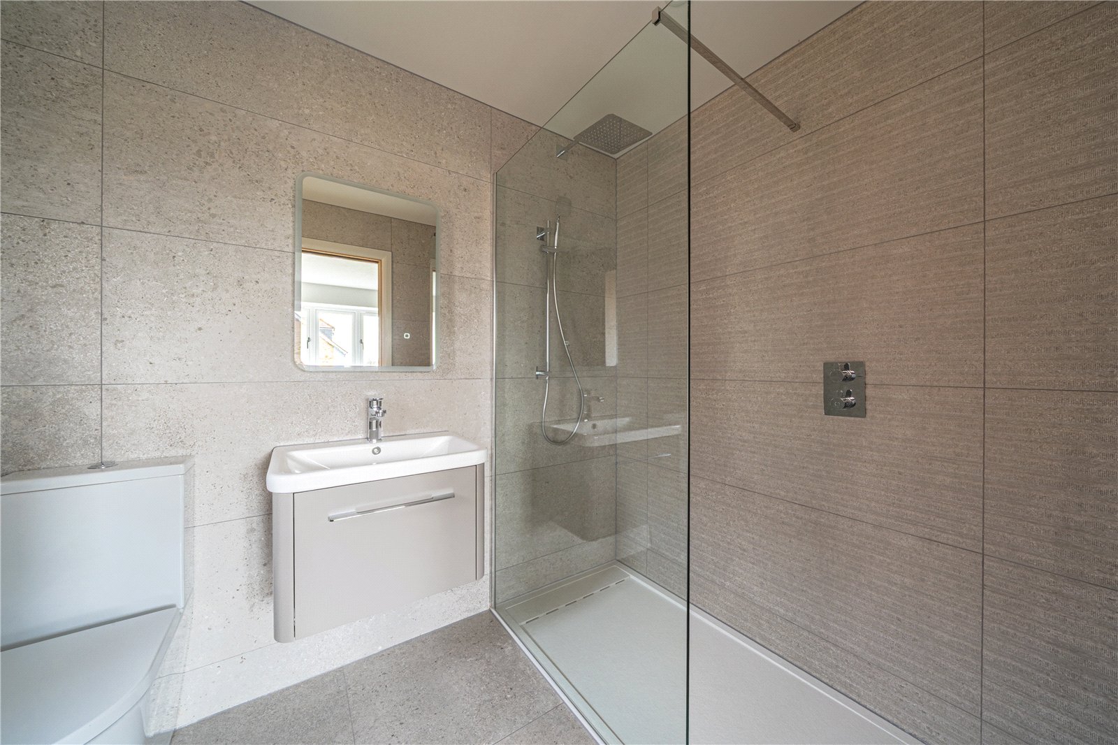 BEDROOM THREE ENSUITE LUXURY SHOWER ROOM: Approached through a sliding oak door and comprising of fully tiled walls and floors, under floor heating, WC, double sized heavy glazed fronted shower with fully tiled walls and chrome controls, wash basin with chrome mixer tap, vanity drawer under, wall mirror with touch light control, extractor fan, triple glazed frosted window, downlighting.