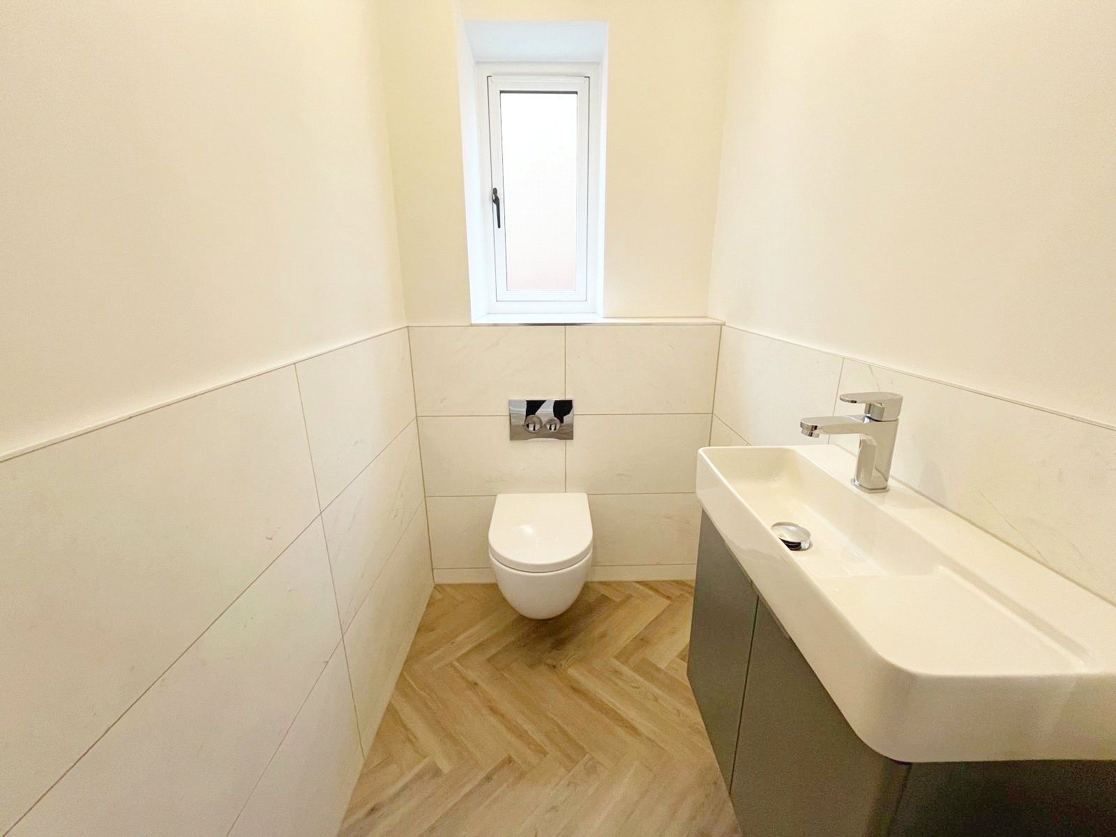 CLOAKROOM: Comprising of a continuation of the Karndean herringbone wood effect floors with underfloor heating, W/C with concealed cistern and chrome flush, half level tiled walls extra fan, ceiling light, wash basin with chrome mixer tap and vanity cupboard under triple glazed frosted window.