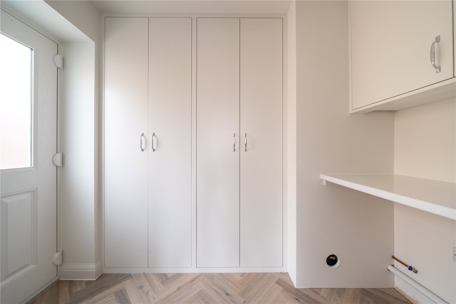 UTILITY ROOM: Approached from the kitchen and also from outside from the side terrace. This room comprises of Karndean herringbone wood effect floors with underfloor heating, fitted work top with spaces under for a dryer and also a washing machine, thermostat room control, range of fitted cupboards, down lighting, panelled and frosted triple glazed door to outside.