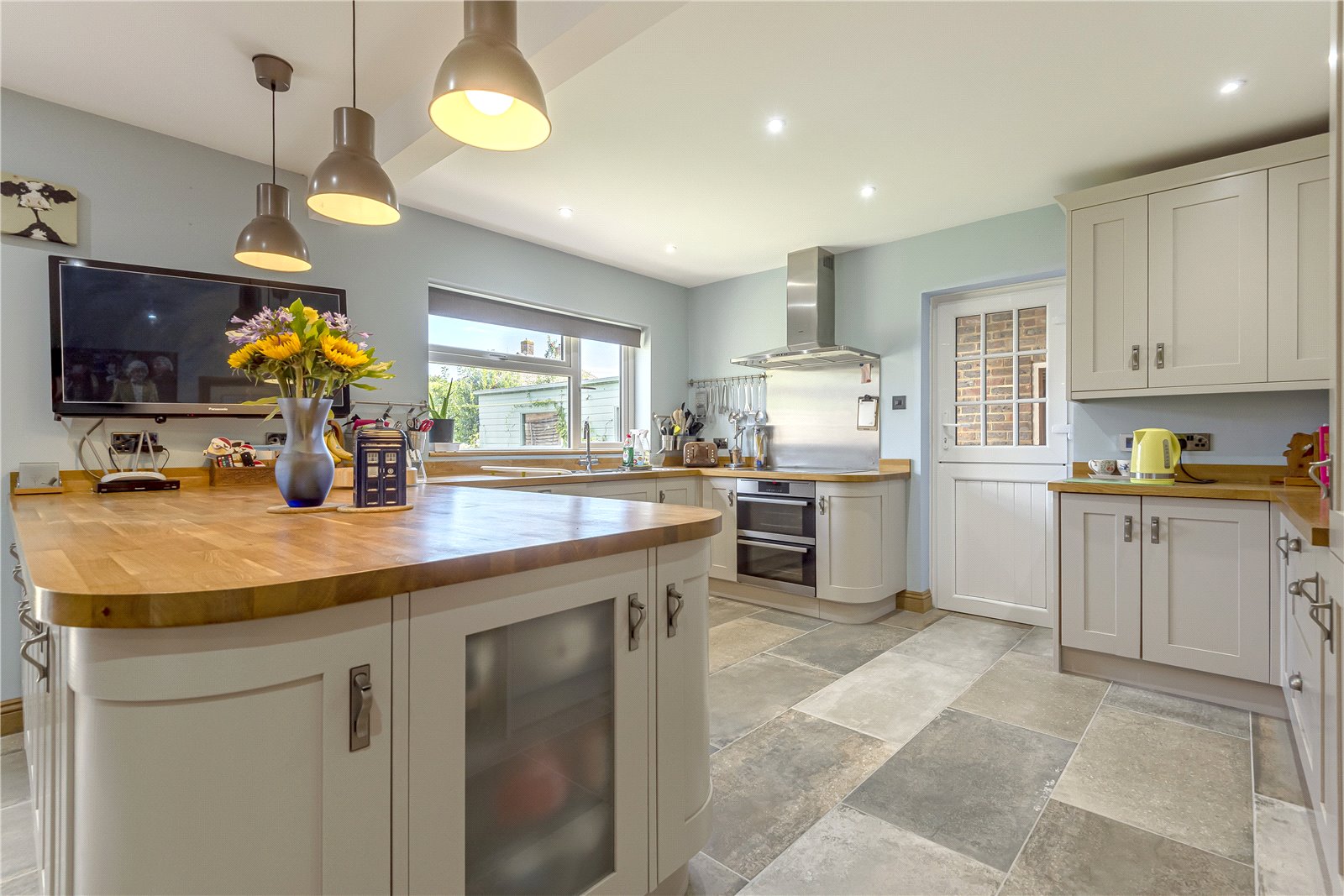 KITCHEN BREAKFAST ROOM (OPEN PLAN) : An elegant and impressive SHAKER STYLE kitchen with solid wood doors and antique styled metal handles. This wonderful quality kitchen has an extensive range of shaker style cupboards and base units with beautiful wooden oak preparation work surfaces over, including the wooden breakfast bar area. There is a fitted AEG combination microwave with plate warmer, a further AEG fitted double oven, a Bosch 5 ring fitted induction hob with an AEG extractor hood over, LED under cupboard and base unit lighting, fitted 1 ½ sink unit with chrome tap, full height extending larder cupboards, under floor heating, down lights and double glazed windows overlooking the rear garden. Double glazed cottage style stable door leading to rear porch.