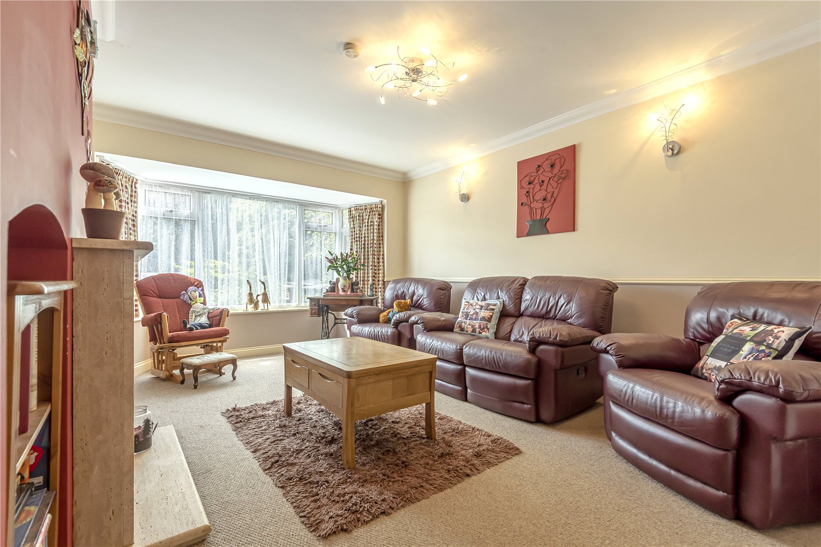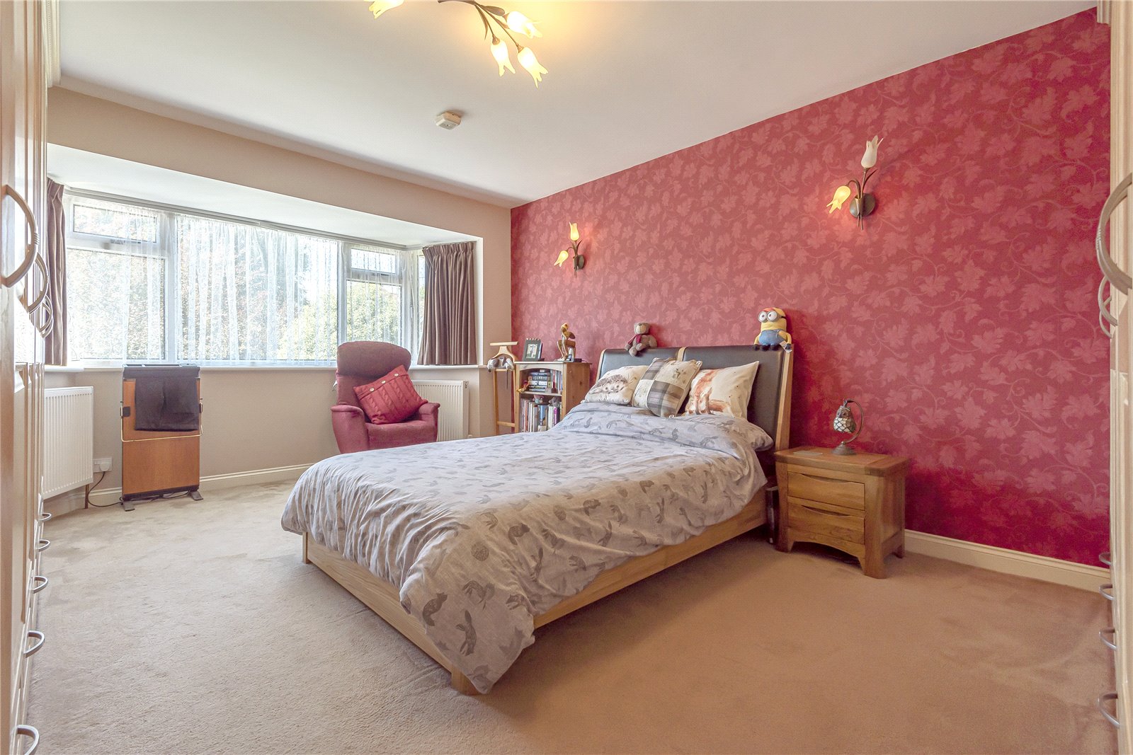 BEDROOM ONE: With elegant full height fitted oak fronted wardrobe cupboards, feature ceiling light and matching feature wall lights, SMART light switches, radiators, double glazed bay window with outlook over front garden and driveway.