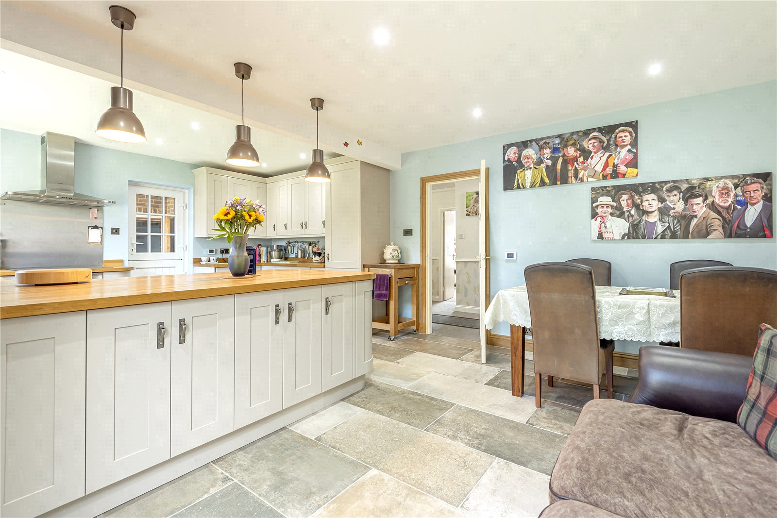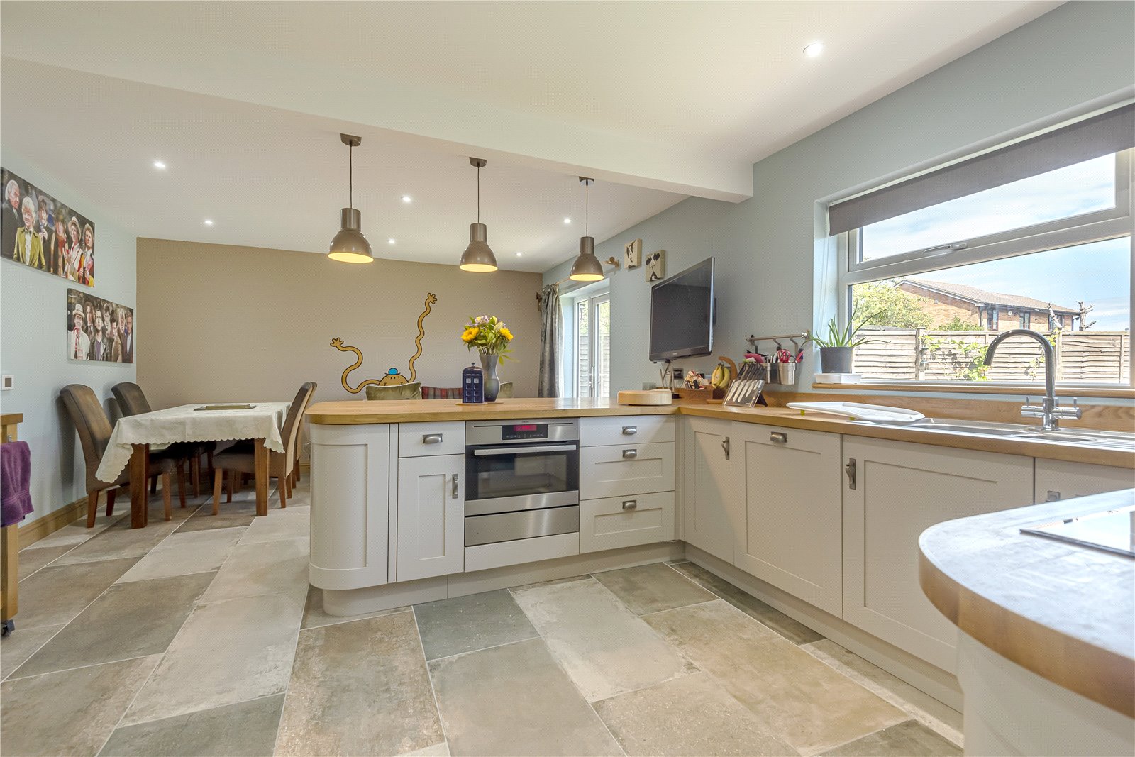 DESCRIPTION: A detached 4 / 5 bedroomed family house offered for sale in very good decorative order and having undergone extensive improvements to include an impressive wood SHAKER STYLE KITCHEN with beautiful solid oak wooden work tops covering the extensive preparation areas and breakfast bar. Throughout the house further alterations include a refitted family bathroom / shower room including travertine marble tiling and a similar travertine marble refitted downstairs cloakroom. There is a large downstairs double aspect study that can also be used as bedroom 5. Off the nicely proportioned reception hall there is also a sitting room with a feature travertine marble fireplace. The open plan dining room which leads to the elegant refitted SHAKER STYLE KITCHEN / BREAKFAST ROOM has a double glazed French door opening to the rear garden, with both the kitchen breakfast room and dining room benefitting from underfloor heating. Outside the property has parking for approximately 5 cars, as well as an attached garage with a utility area. In addition to the garage there is currently a large wooden workshop in the rear garden with ample electric supply.