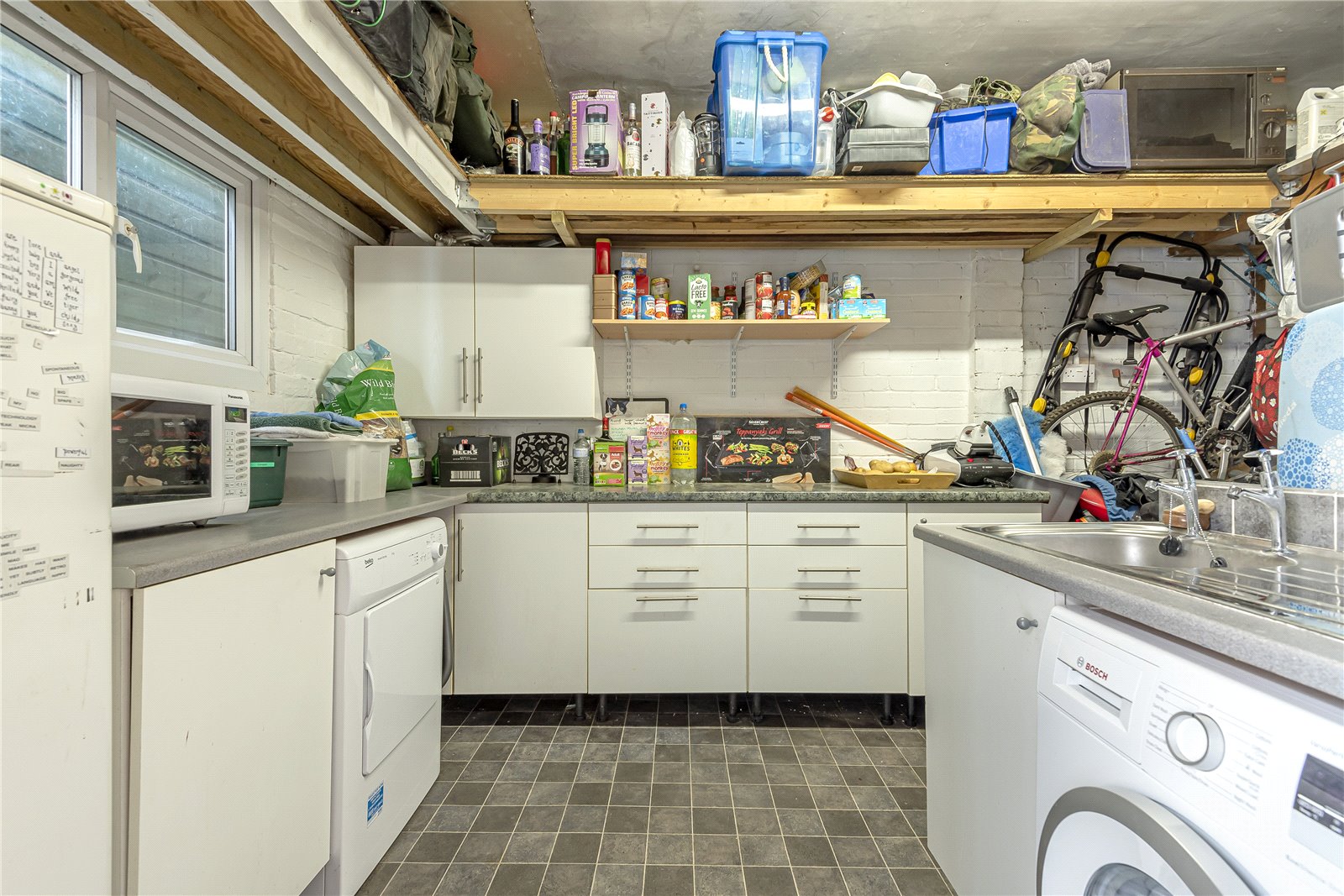 INTEGRAL GARAGE / UTILITY AREA : Comprising of a range of base and cupboard units with work surfaces over, fitted stainless steel sink unit, space for dryer, space and plumbing for washing machine, ceiling light, double glazed window. Extending beyond the utility area is the garaging area with further power points and electric raising retractable front garage door.
