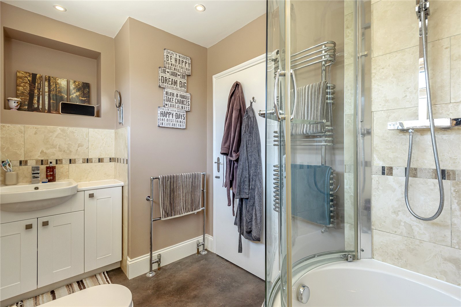 BATHROOM / SHOWER ROOM: Having been refitted with travertine tiled marble walls, WC, fitted wash basin with chrome tap and fitted cupboard, feature wall mounted chrome heated towel rail, fitted bath with concaved upper side with matching concaved shower glazed and chrome side over, chrome shower control system and shower head, additional corner chrome shower attachment down lights, double glazed window.