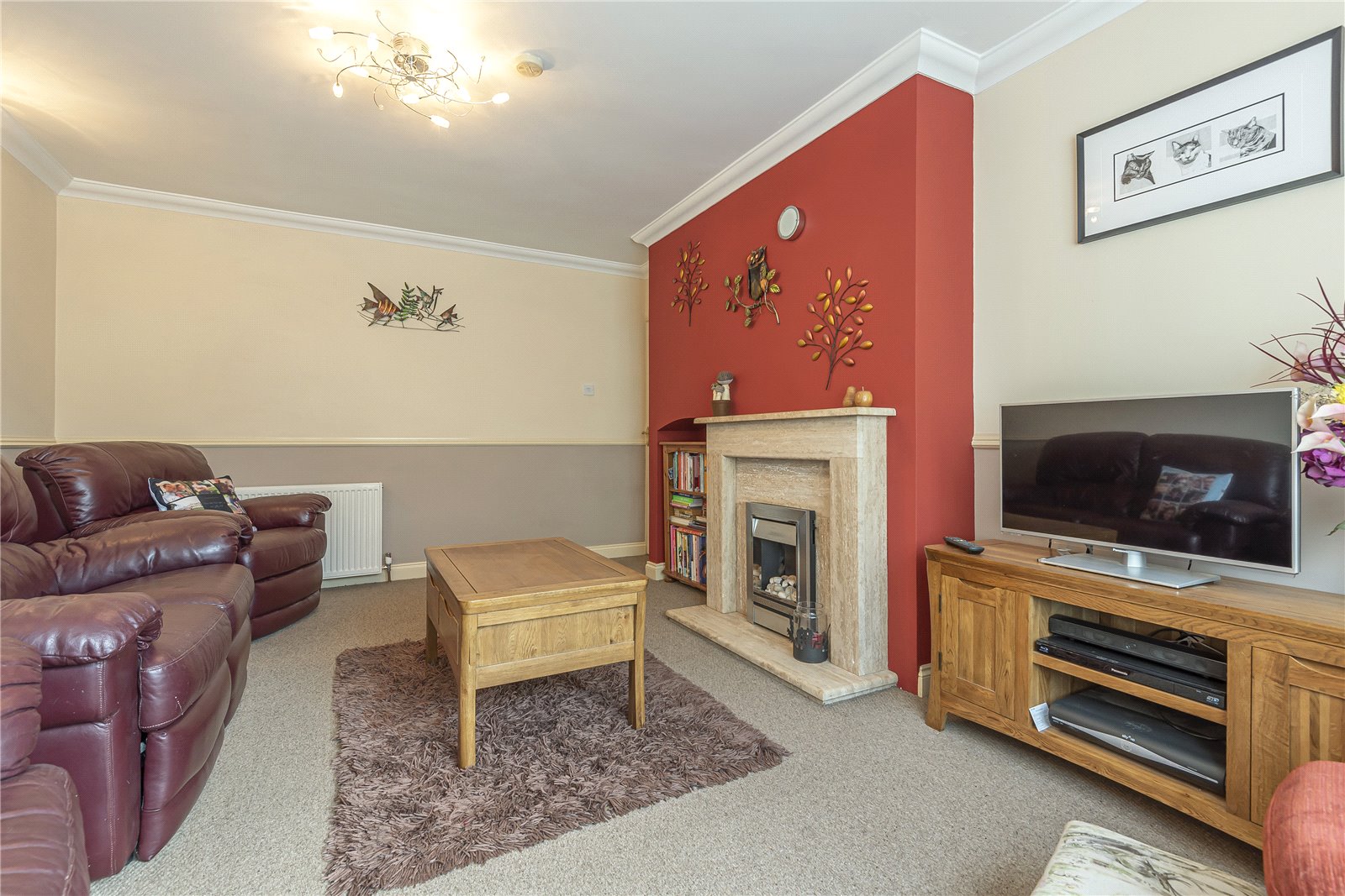 SITTING ROOM : With an attractive travertine marble fireplace with fitted gas fire, dado rails, radiator, coved ceiling, feature ceiling light with matching feature wall lights, double glazed bay window with outlook over the front garden and driveway.