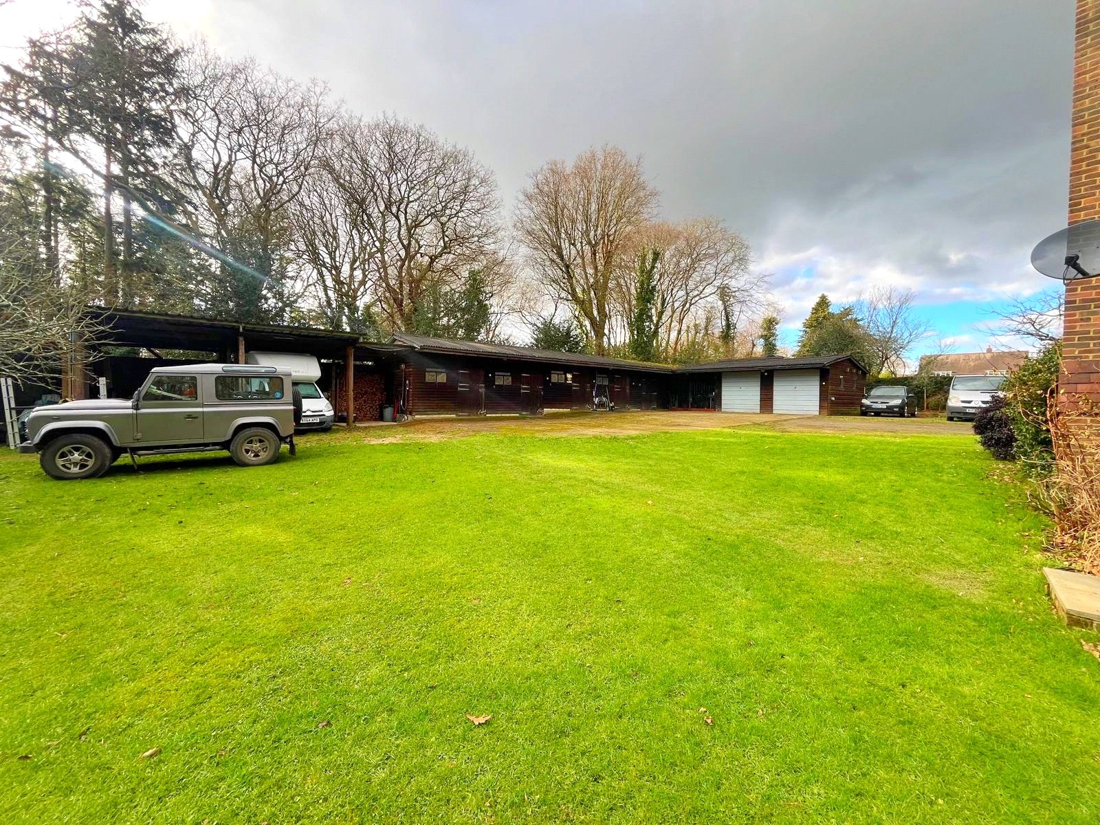 The detached stable complex also includes a double garage and corner storage barn.