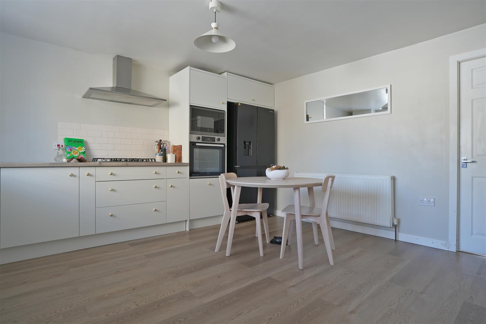 Dining Kitchen - 4.453 x 3.987 (14'7" x 13'0") - Modern fitted kitchen with a range of wall and base units. Composite one and half bowl sink. Eye level electric oven. Gas hob. Stainless steel cooker hood over. Integrated microwave. Plumbing for washing machine. Integrated dishwasher. Boiler. Radiator. Understairs cupboard. UPVC double glazed window to front elevation.