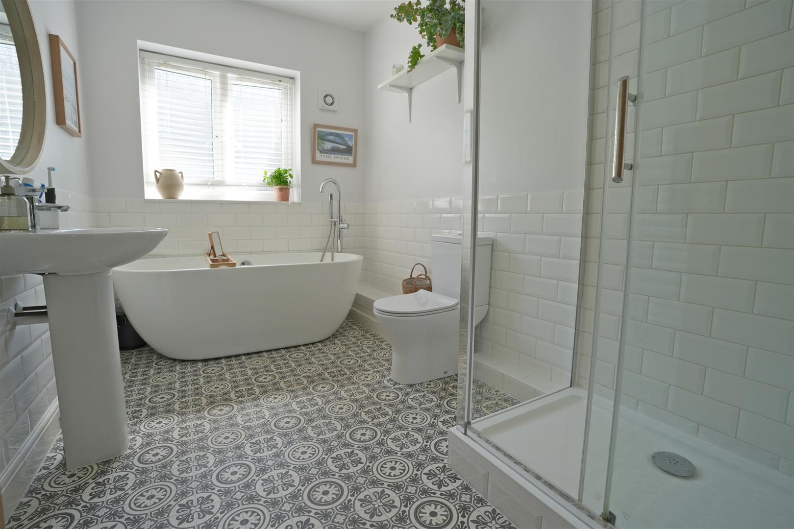 Bathroom - Wash hand basin. Low flush W.C. Freestanding bath with mixer taps and shower head. Separate shower cubicle. Partially tiled. Extractor fan. Towel radiator. UPVC double glazed window to rear elevation.