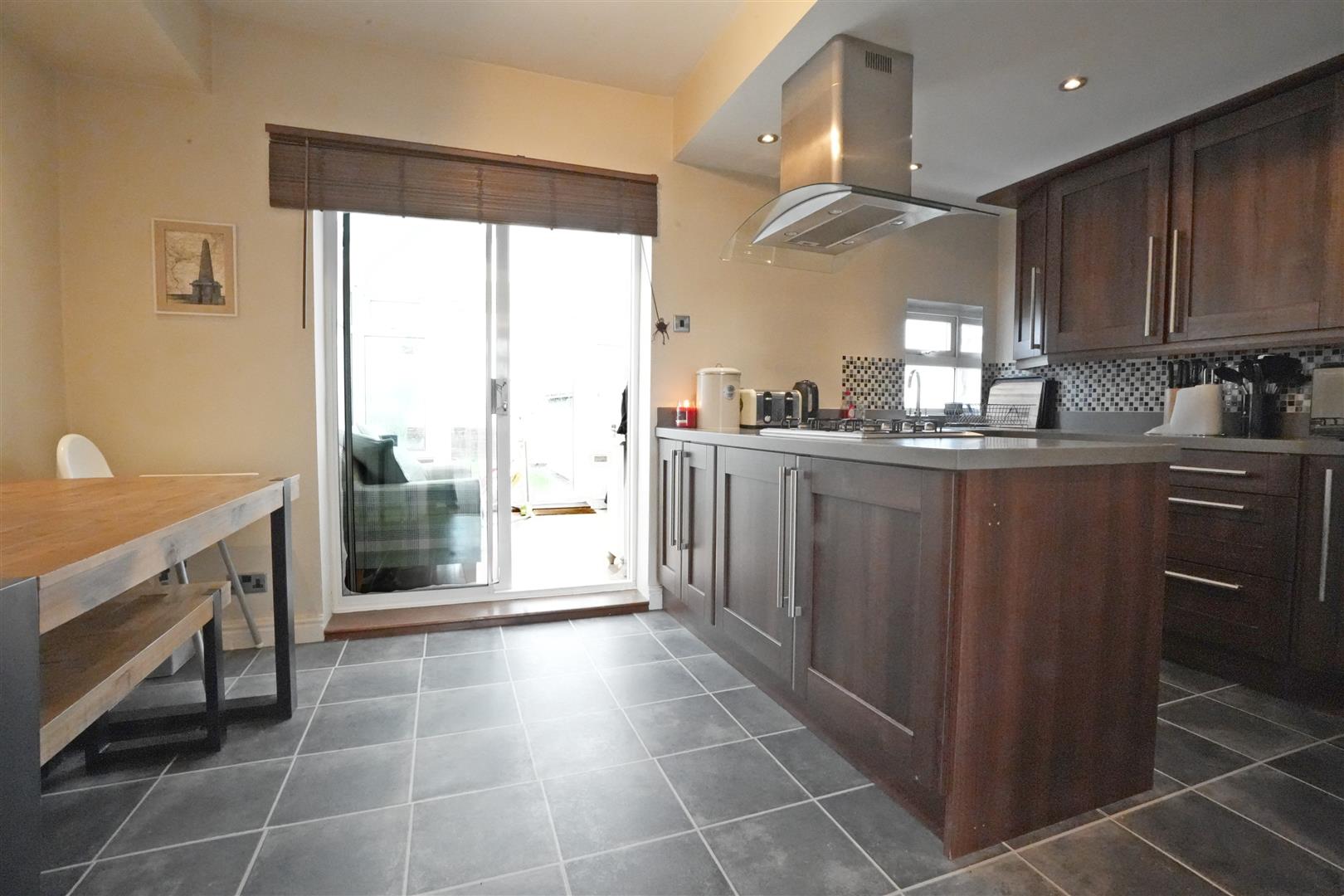 Dining Kitchen - 4.654 x 2.621 (15'3" x 8'7") - Fitted kitchen with wall and base units. Stainless steel one and a half bowl sink. Electric oven. Gas hob. Cooker hood. Plumbing for washing machine. Integrated fridge. Designer radiator. Understairs cupboard. Boiler. Patio doors leading to conservatory. UPVC double glazed window to rear elevation.