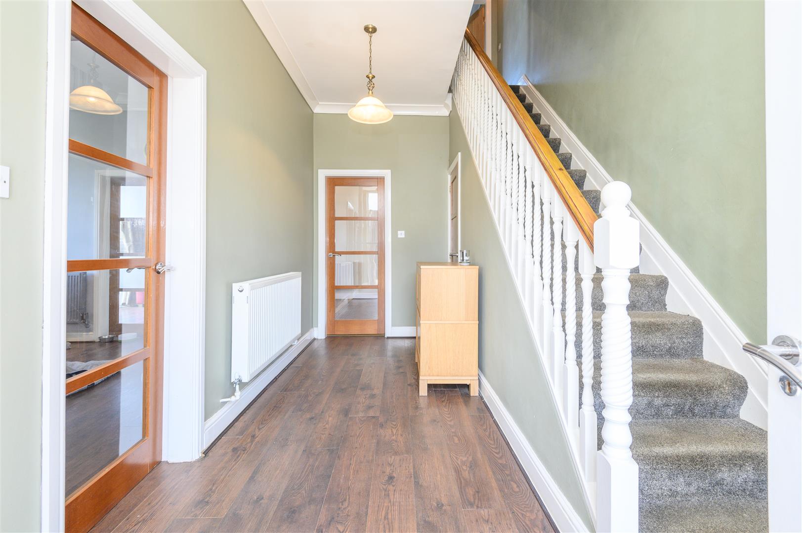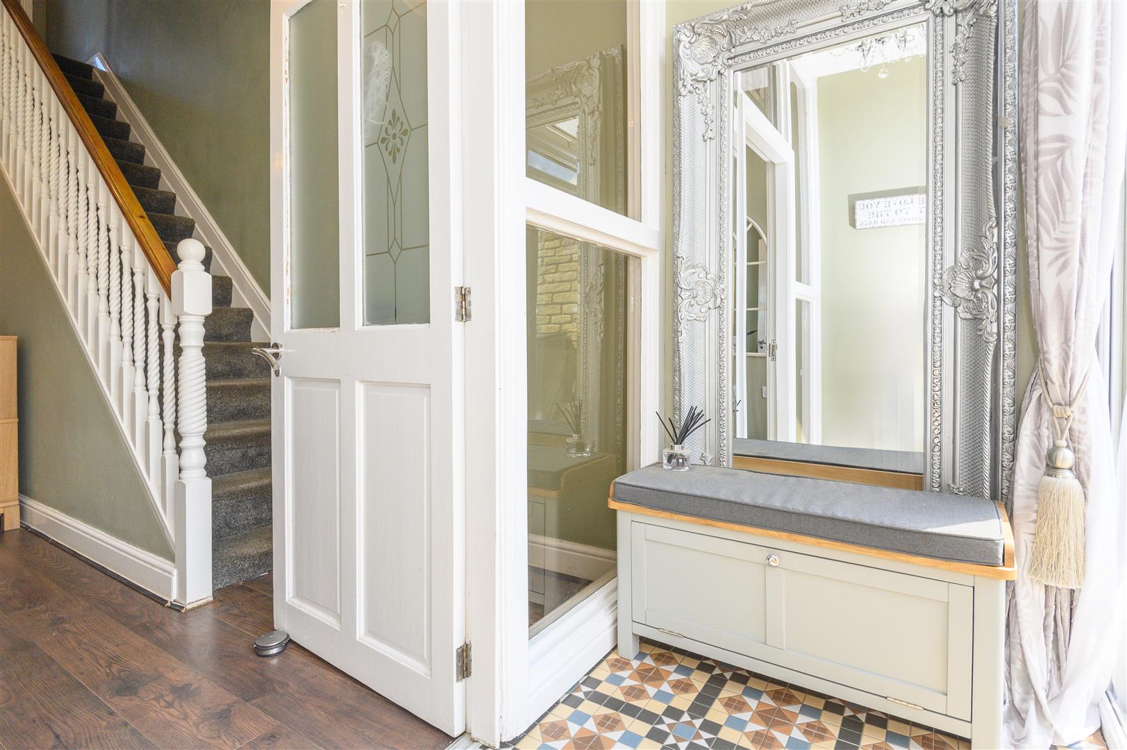 - High ceilings, cornicing, and stained-glass details throughout