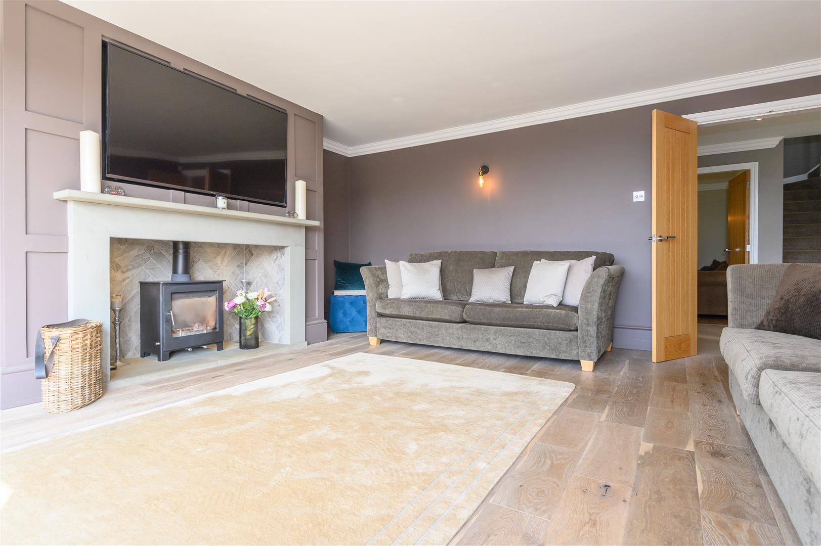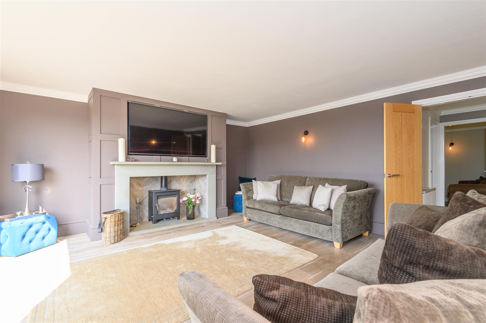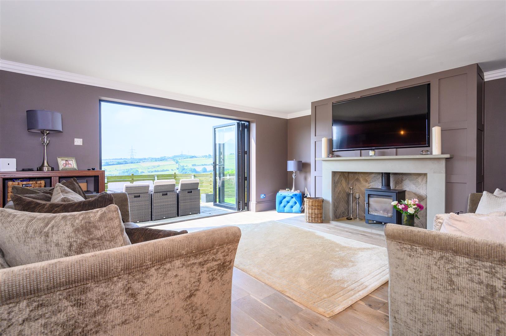 - Elegant living room with feature fireplace and bifold doors to south-facing garden