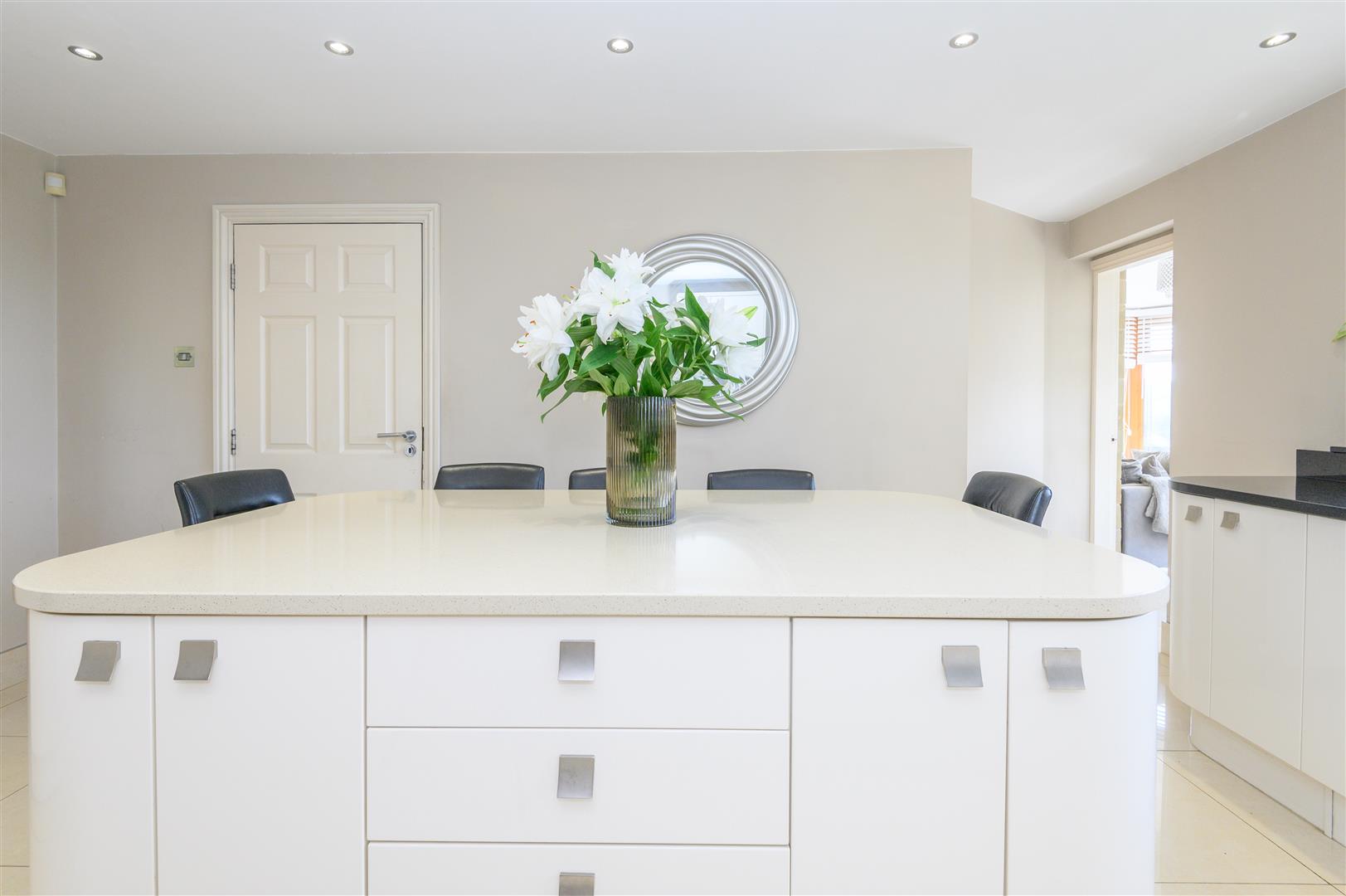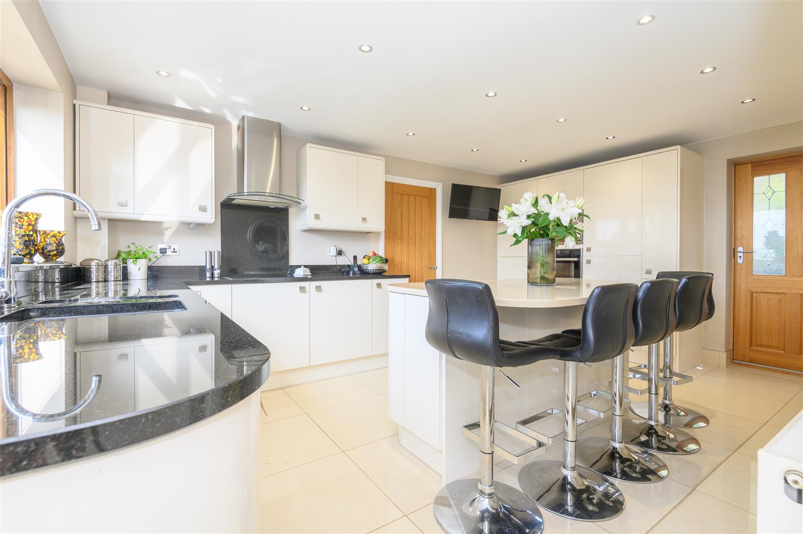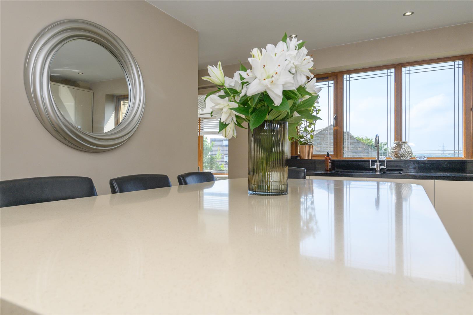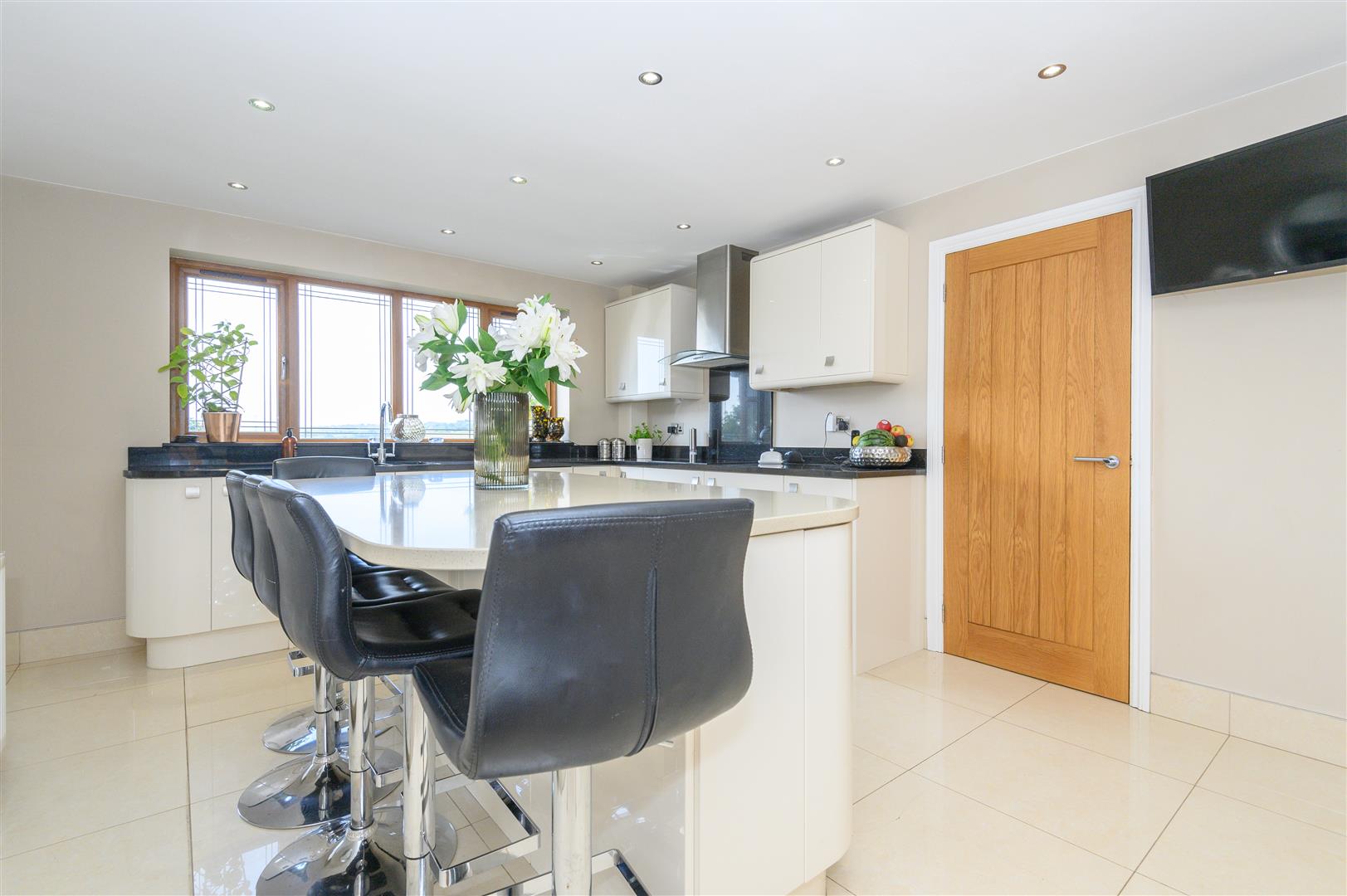 - Contemporary kitchen with island, integrated appliances and panoramic outlook