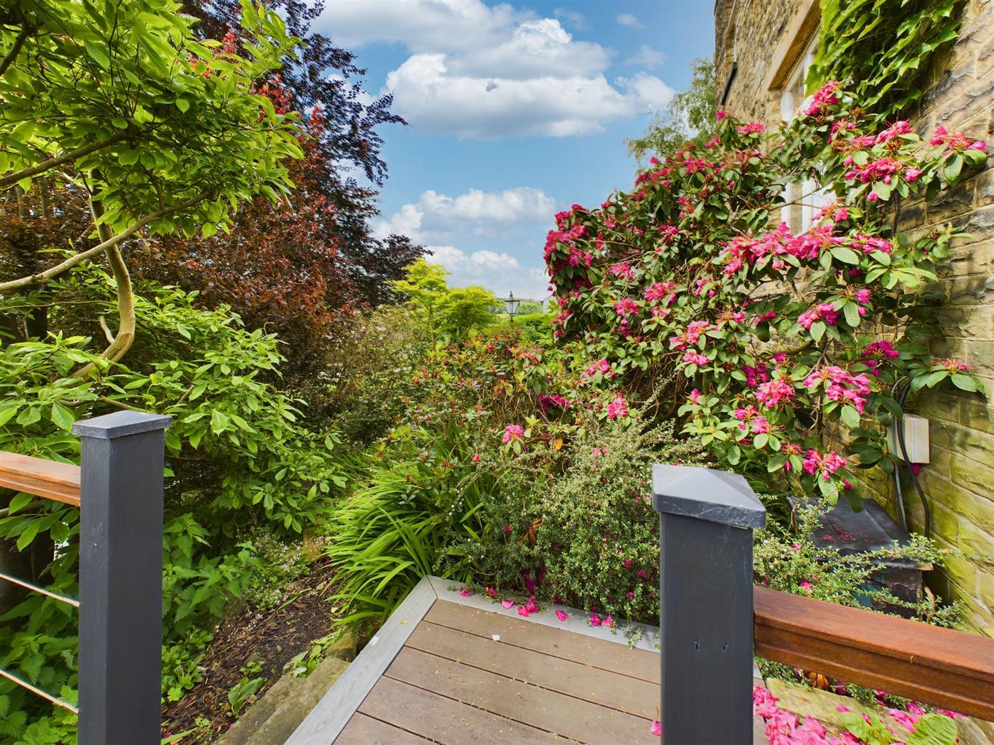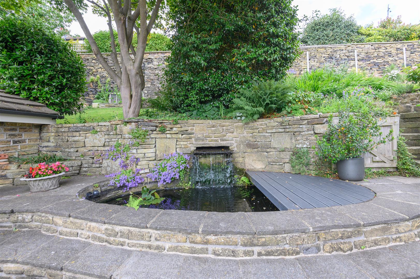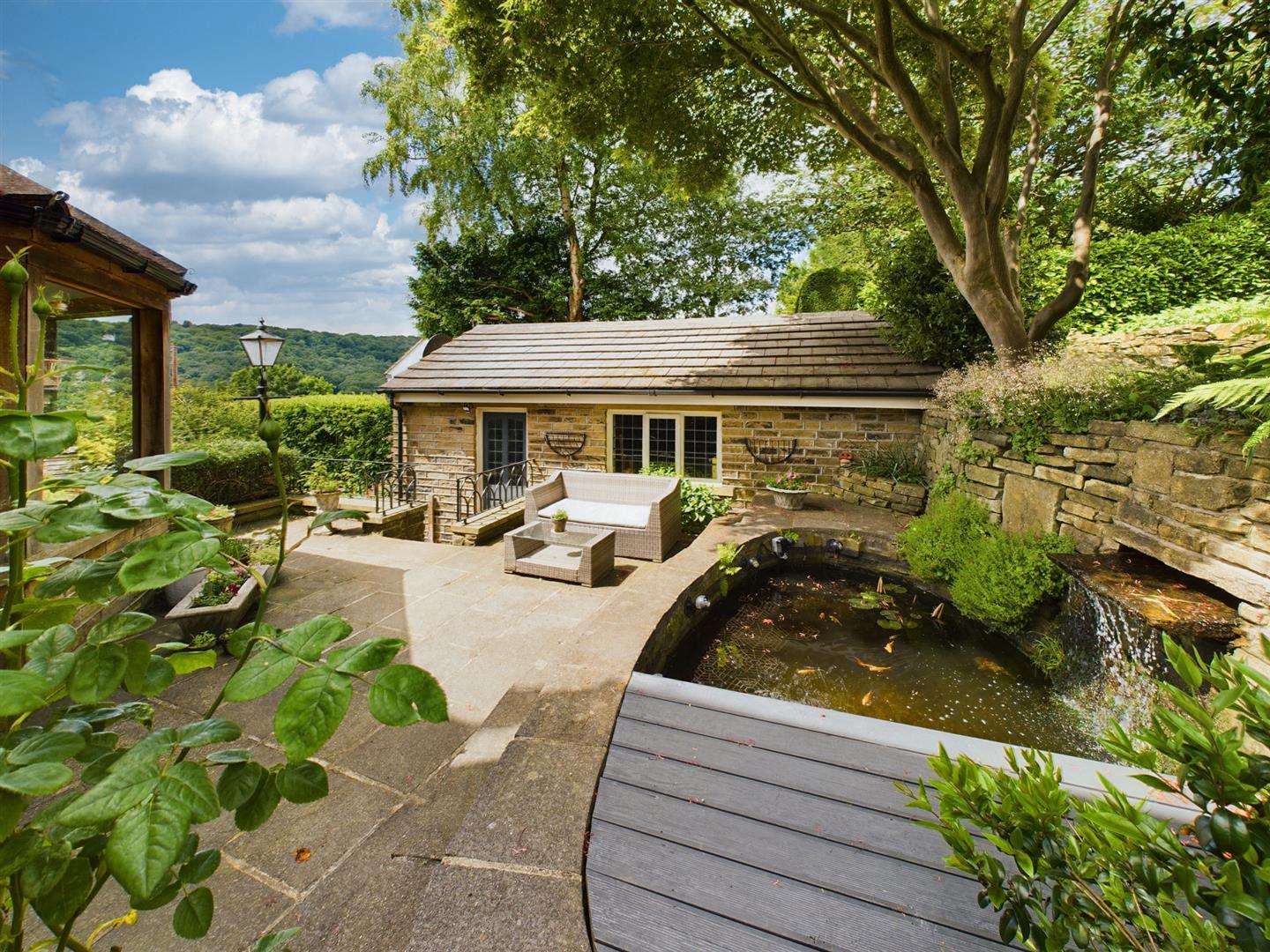 - Large wraparound gardens with multiple seating areas, summerhouse, and koi pond