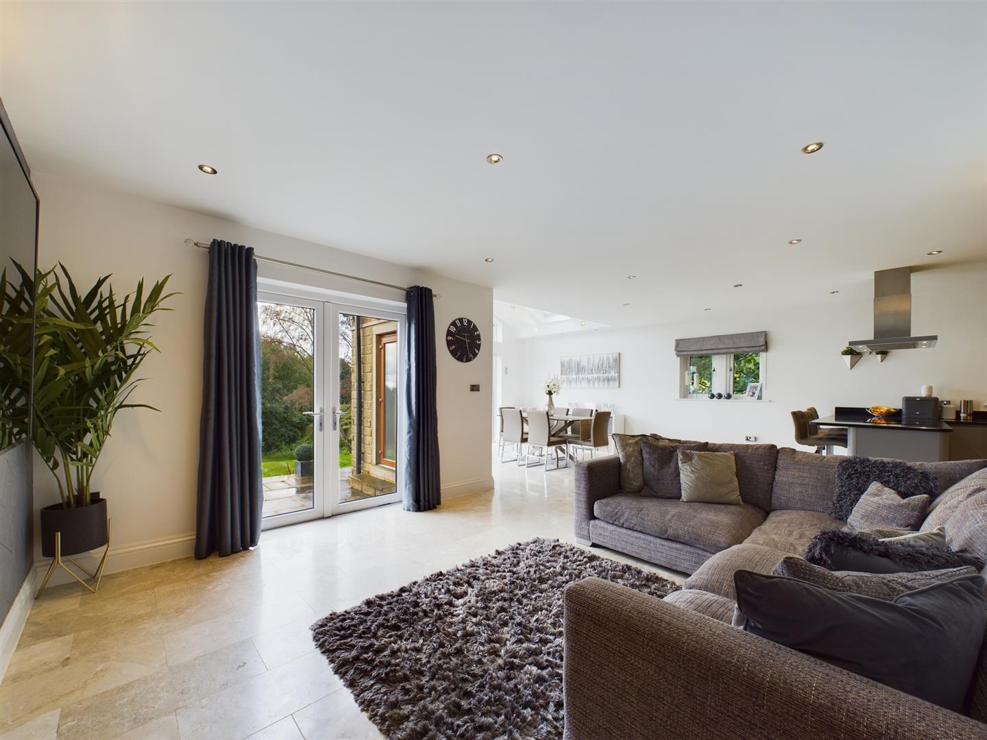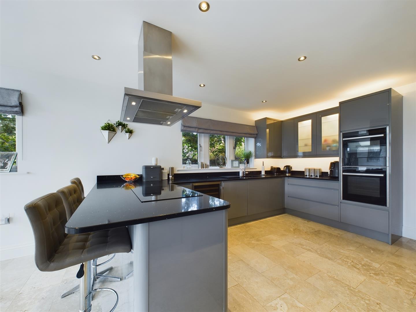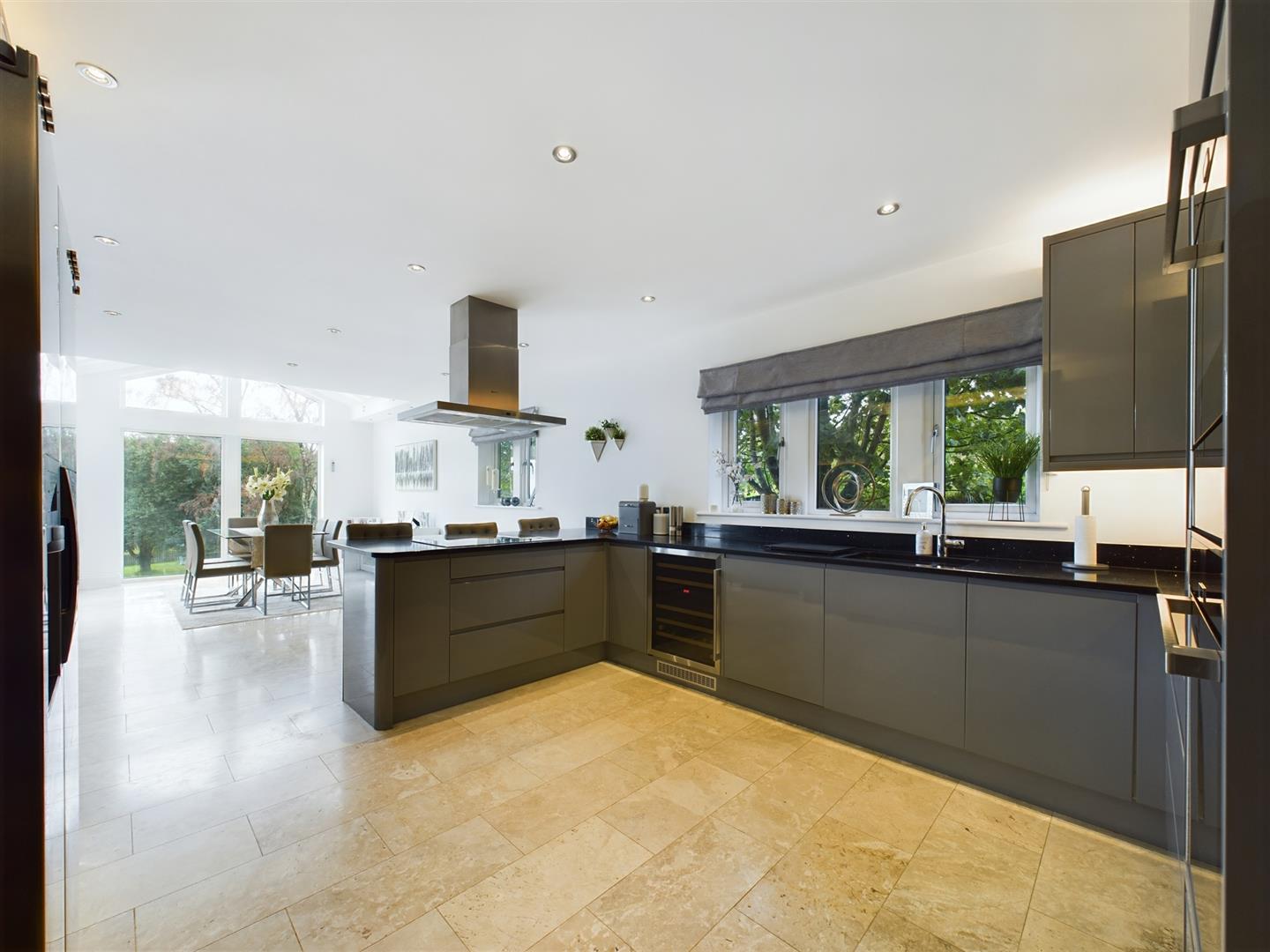 Being the heart of this contemporary family home, the spacious kitchen diner upholds a high, modern aesthetic with tiled flooring continuing through, again benefitting from the addition of underfloor heating. This generous room enjoys dual aspect windows, enjoying views across the garden, patio doors leading out to the rear terrace and Velux weather sensitive electric skylights, filling the space with natural light. The kitchen boasts a wide range of grey, high gloss wall, drawer, and base units, granite worksurfaces and an undermounted, composite one and a half bowl sink. The kitchen enjoys NEFF appliances throughout including a double, eye level electric oven, microwave and grill, four-ring induction hob and an extractor. Additional appliances include a dishwasher, double fridge freezer and a wine fridge.