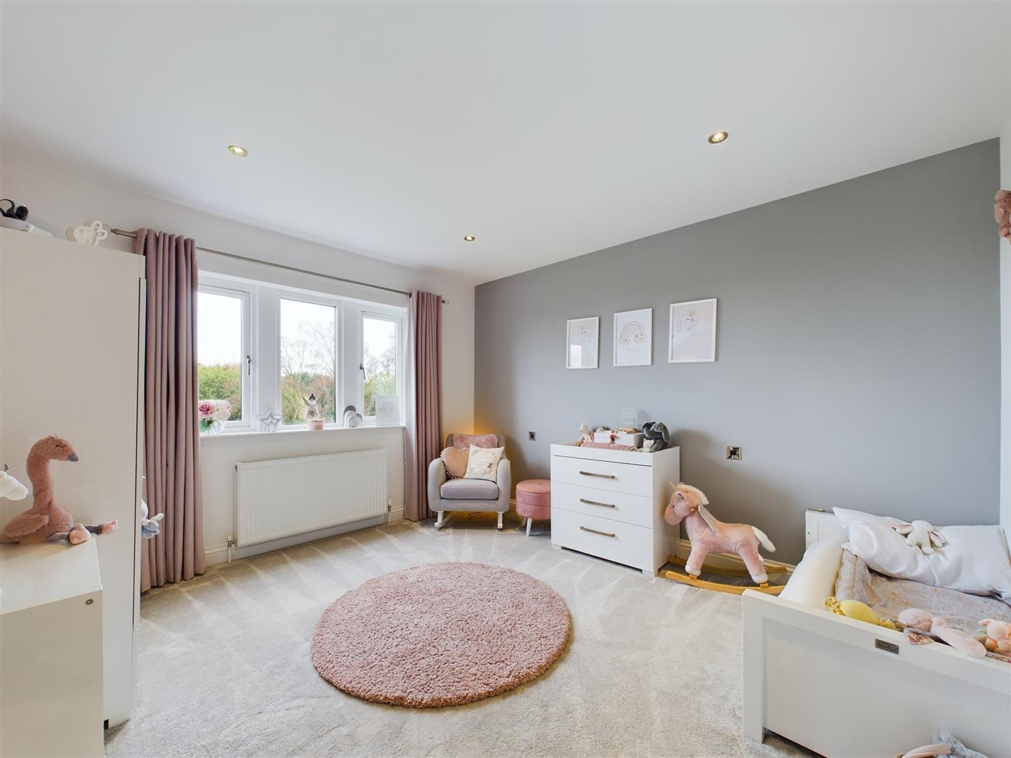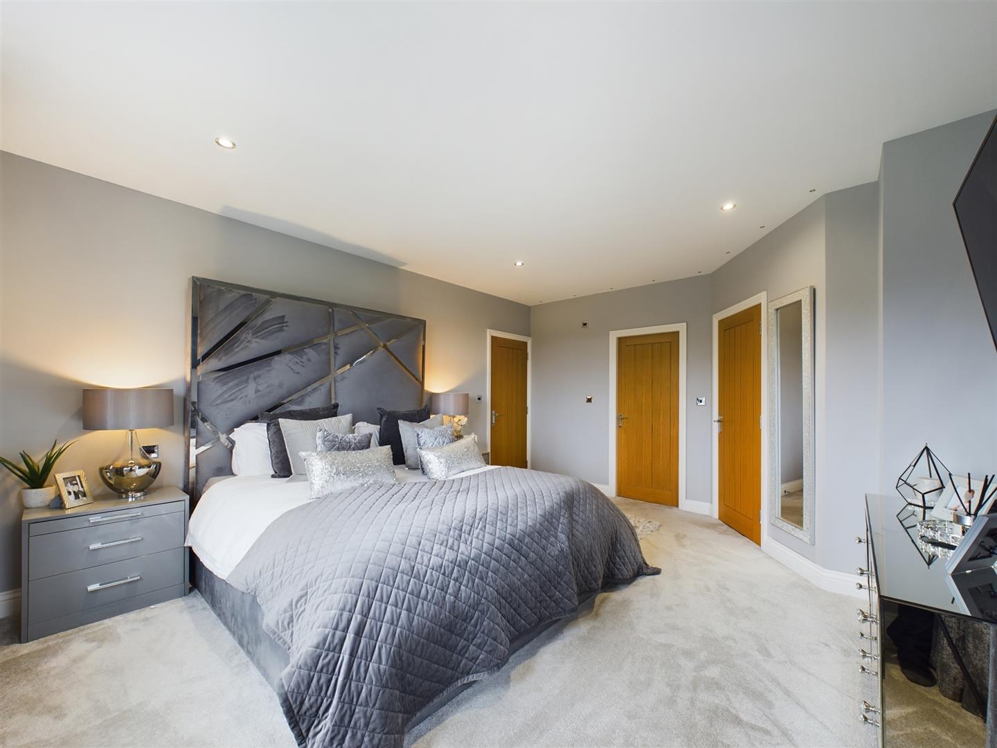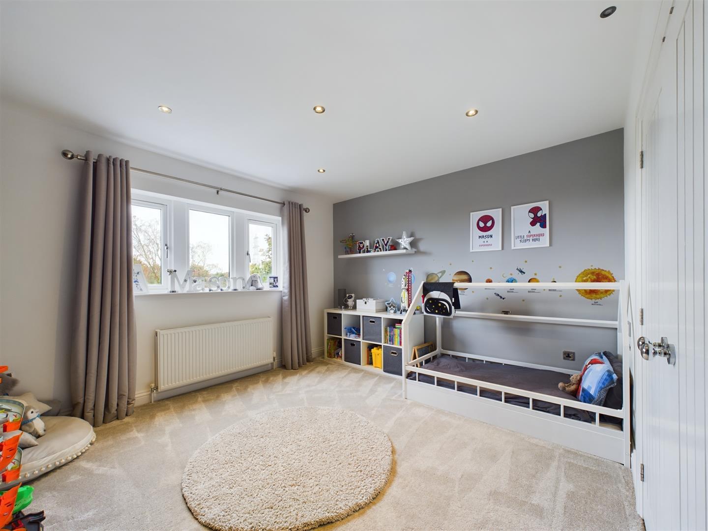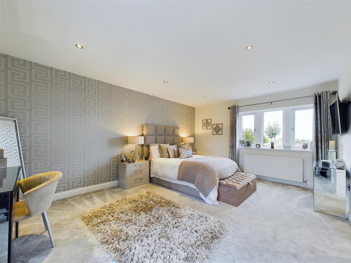 Entering the excellent sized principal bedroom with dual aspect windows, carpeted flooring, and spotlights to the ceiling. This generous double bedroom benefits from access into a walk-in wardrobe and an en-suite shower room. The contemporary, fully tiled en-suite showcases smart motion sensor lighting, present throughout the first-floor accommodation and comprises of a three-piece suite including a low flush WC, wash hand basin and a walk-in shower cubical with a rainfall shower and additional handheld shower attachment. Showcasing spotlights to the ceiling, underfloor heating, and a laddered heated towel rail.