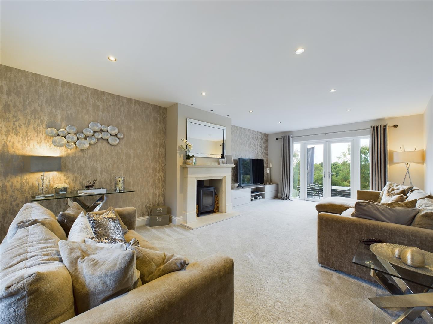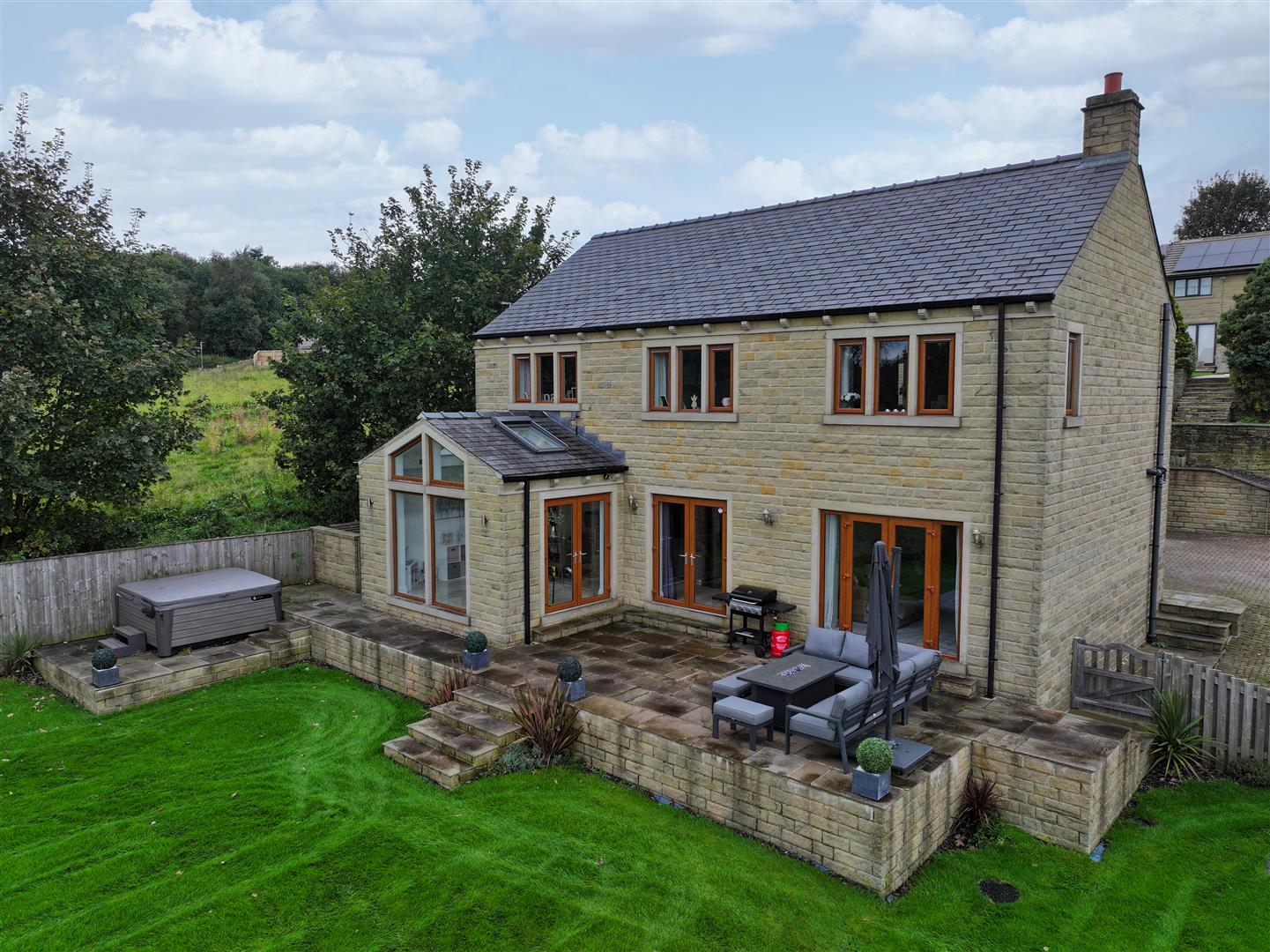 Unique bespoke features include external hot tub; solid fuel burning stove, underfloor heating to ground floor, integrated electric vehicle charging point to garage, smart Hue lighting, smart locks, extended gardens and private woodland.
