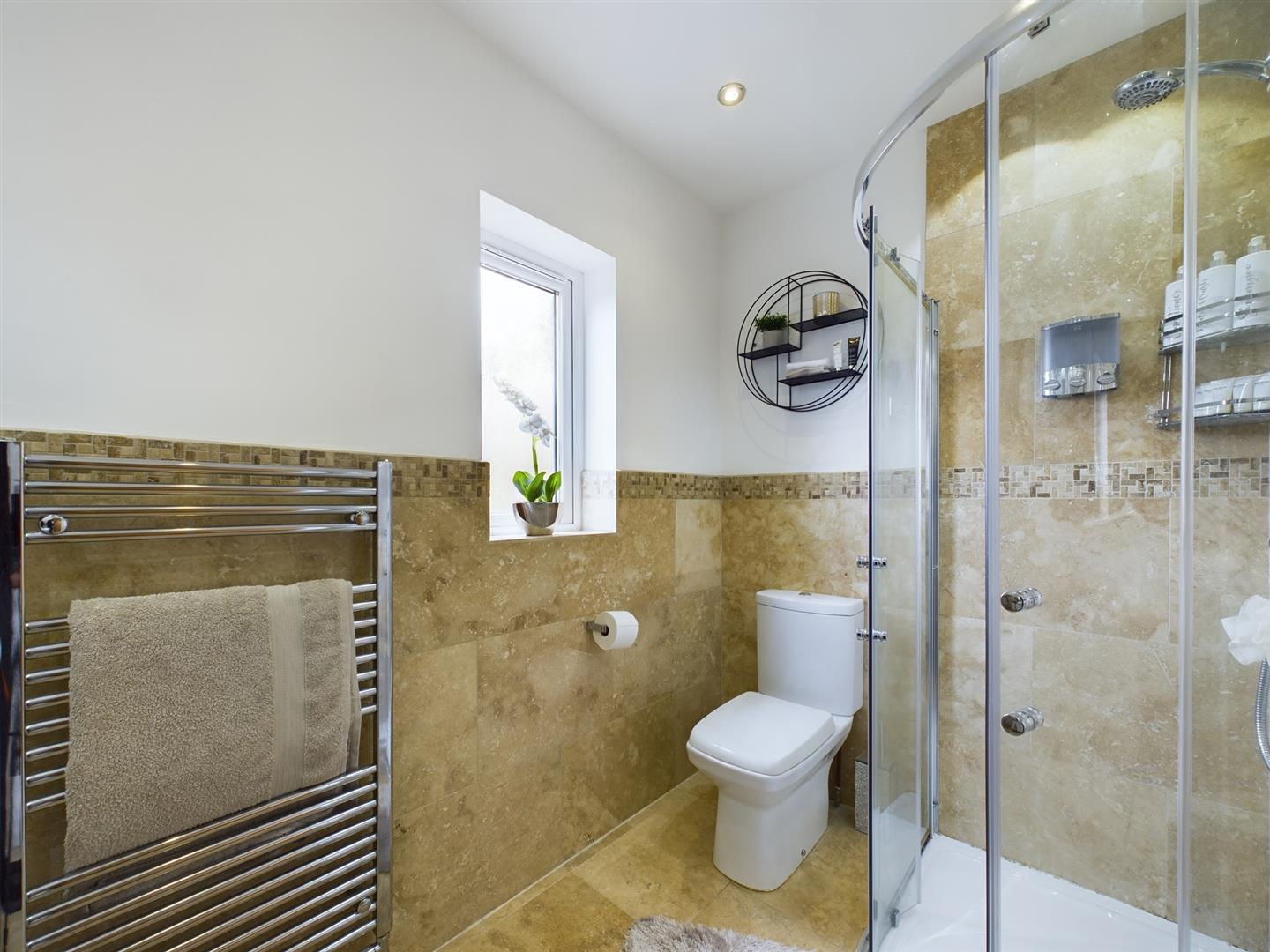 Mirroring the size of the principal bedroom, the second bedroom again benefits from dual aspect windows, carpeted flooring, and spotlights to the ceiling. Being a second spacious double with access into an en-suite shower room comprising of a low flush WC, wash hand basin and a shower cubical with a wall mounted, mains fed shower. Having tiled flooring, part tiled walls and a laddered heated towel rail.
