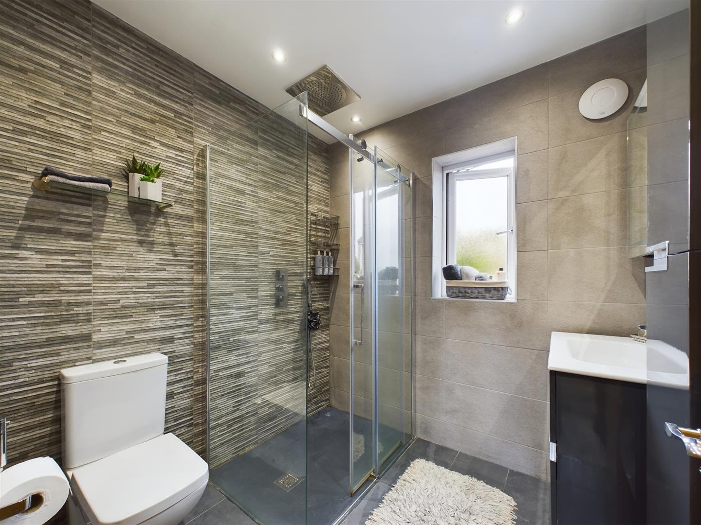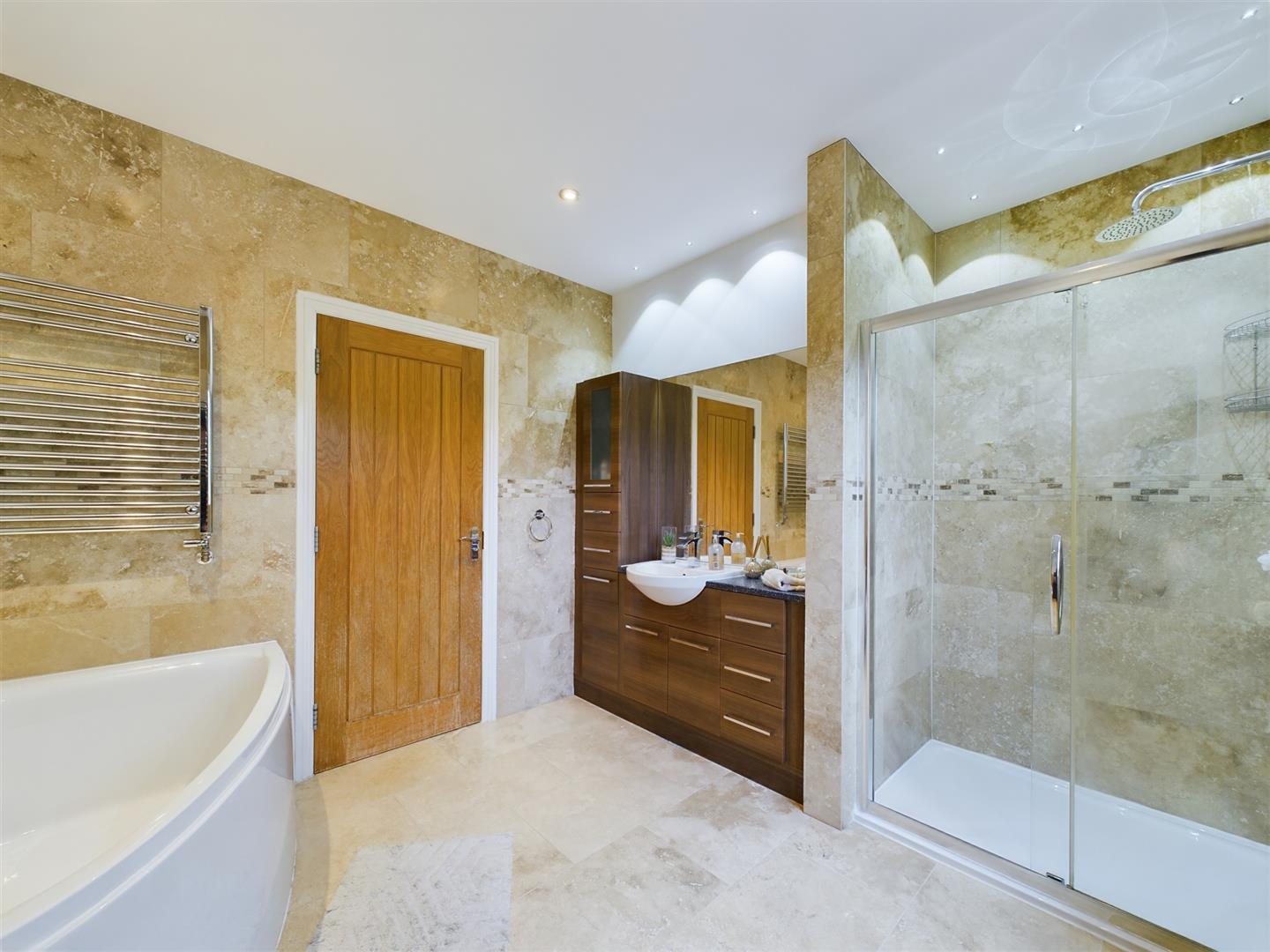 Completing the internal accommodation is the house bathroom. Mirroring the two en-suites on the first floor with contemporary tiling throughout and spotlights. Comprising of a four-piece suite including a low flush WC with a concealed cistern, wash hand basin, a bath with a handheld shower attachment and a walk-in shower cubical with a rainfall shower.