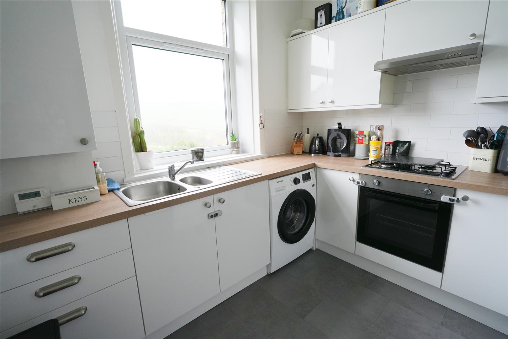 Kitchen - 2.87 x 2.57 (9'4" x 8'5") - Fitted kitchen with wall and base units. Stainless steel one and a half bowl sink. Electric oven. Gas hob. Cooker hood. Plumbing for washing machine. Radiator. Boiler. UPVC double glazed window to rear elevation.