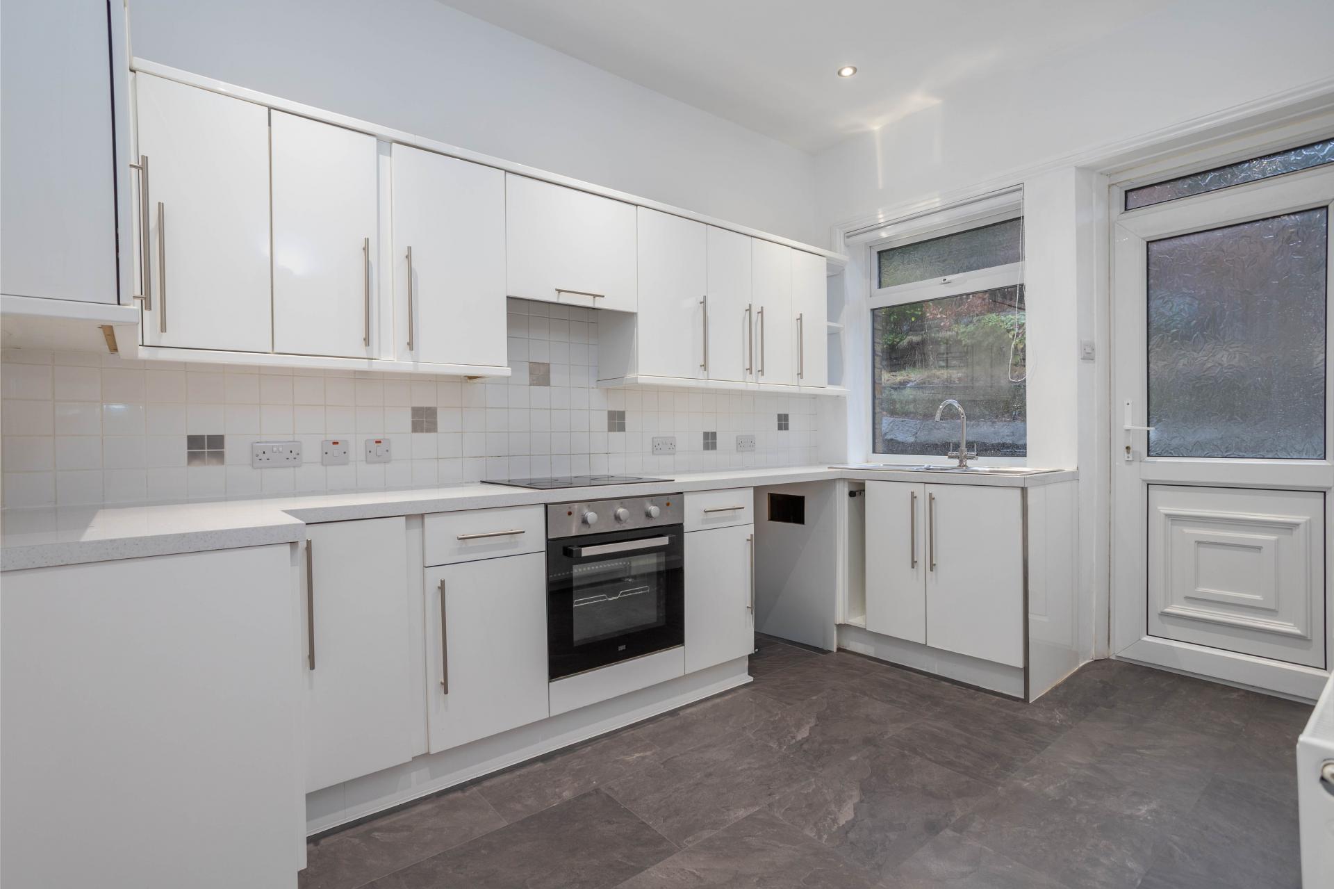 The property is entered via a sunroom, which leads through to a spacious sitting room. The sitting room features a fireplace with an electric fire, creating an attractive focal point. The light and airy kitchen is fitted with a range of white base and wall units with complementary light-coloured worktops and is equipped with a 1½-bowl sink, electric oven, four-ring electric hob, plumbing for a washing machine, and space for a fridge.