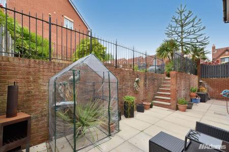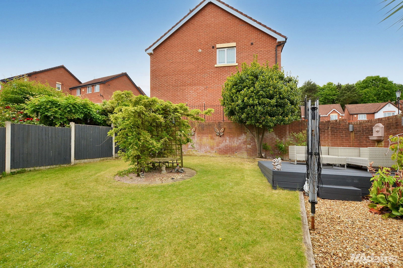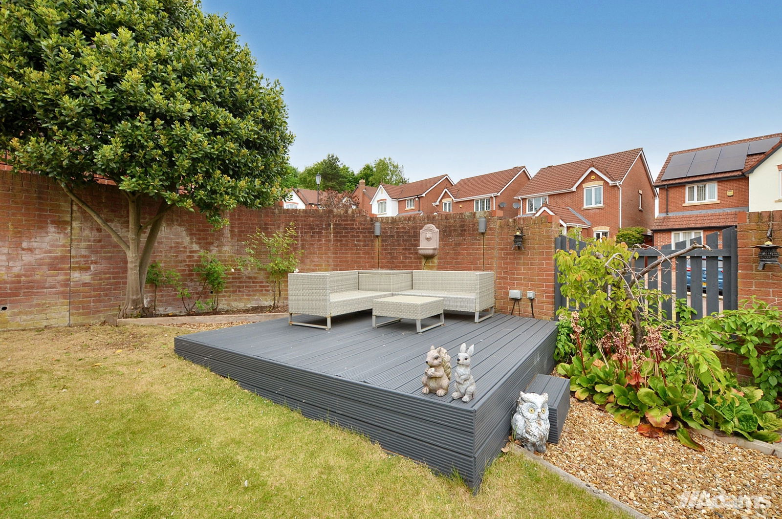 Externally, the property is set within an impressive plot, boasting off-road parking, a front lawn with garage access, and a split-level rear garden—featuring an upper decked patio area and generous garden, perfect for outdoor dining, with steps leading to a lower patio area, providing plenty of space for children to play or for hosting.