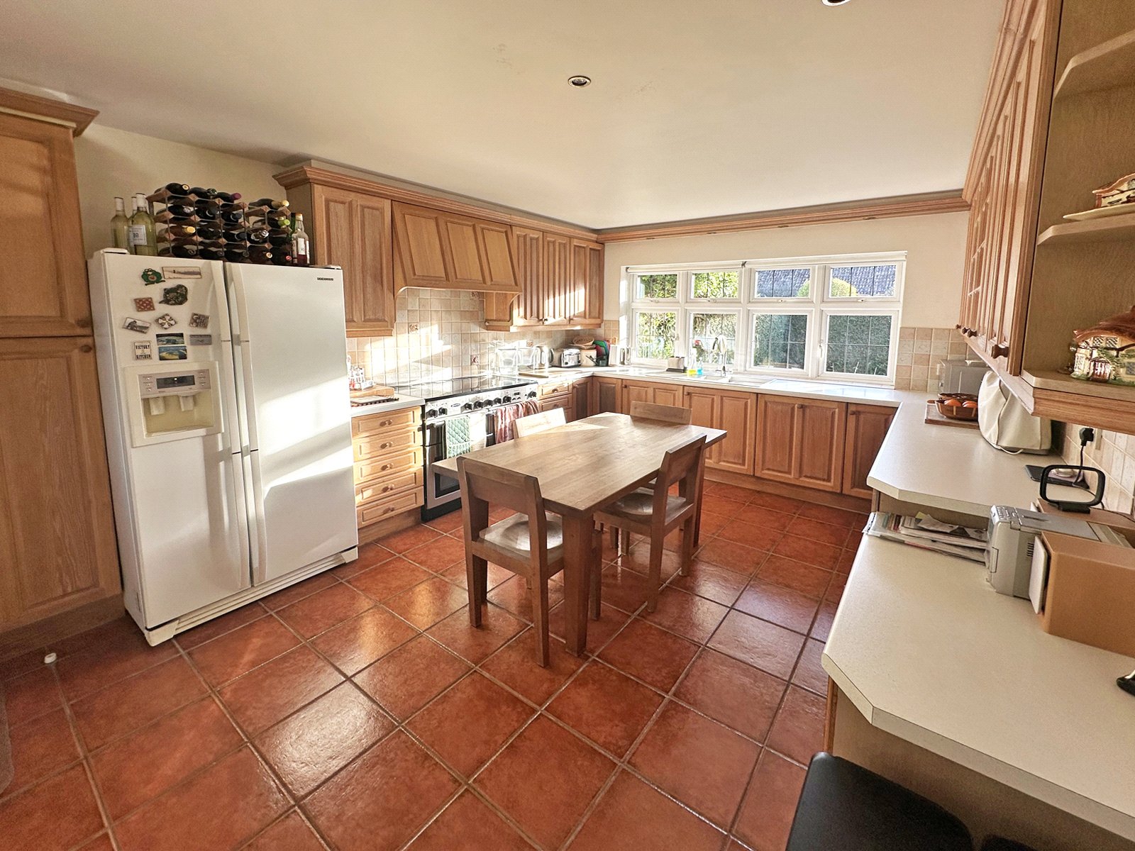 The kitchen is well proportioned and fitted with a range of solid wood units, ample worktop space and integrated appliances these include: Hotpoint dishwasher, Rangemaster professional cooker with fitted extractor over. There is tiled flooring and splashback with large window overlooking front aspect letting an abundance of natural light in.