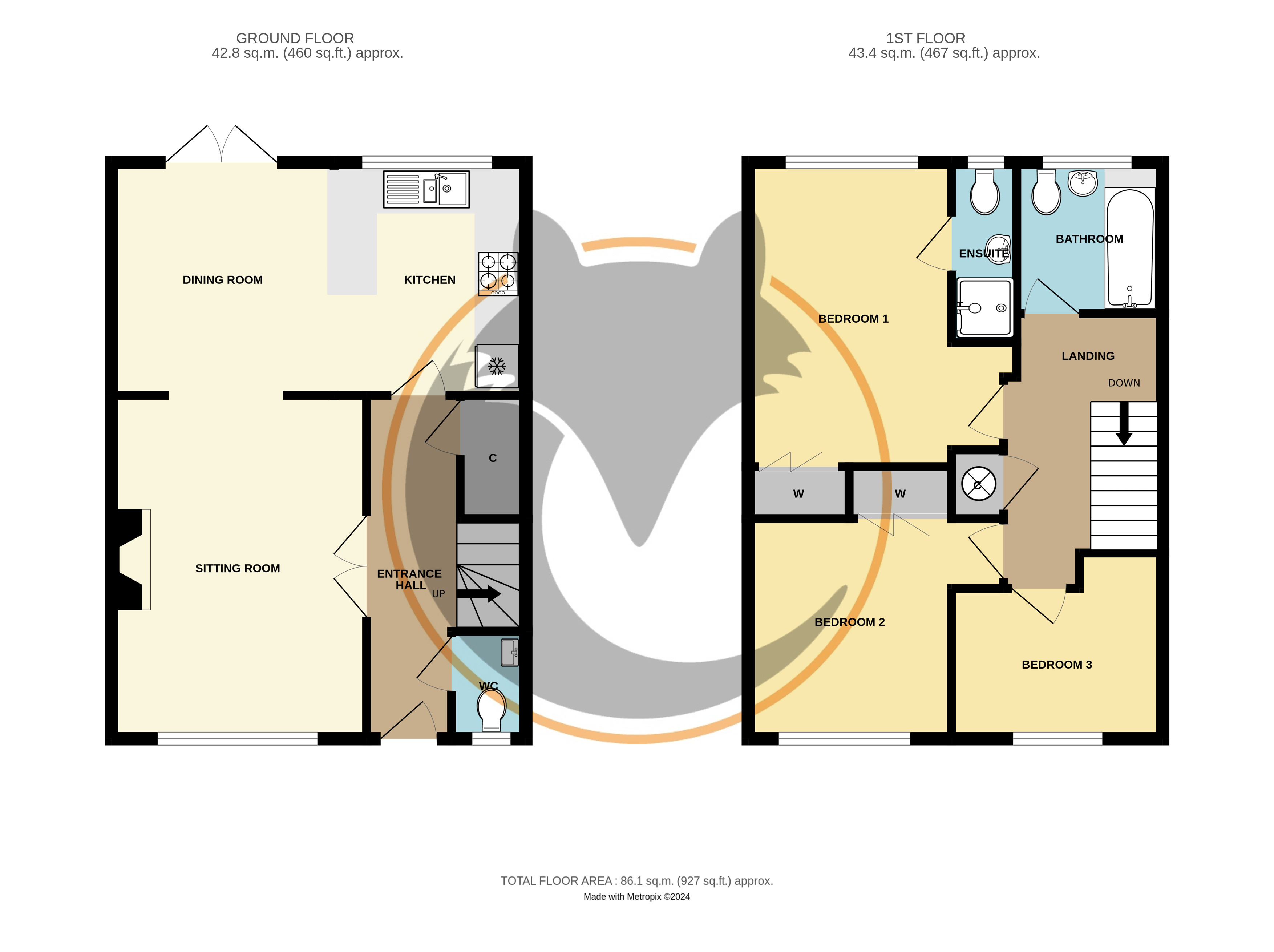 Precis of accommodation: entrance hall, cloakroom, sitting room, kitchen/diner, first floor landing, bedroom one with en suite shower room, two further bedrooms and bathroom. Outside: garage.
