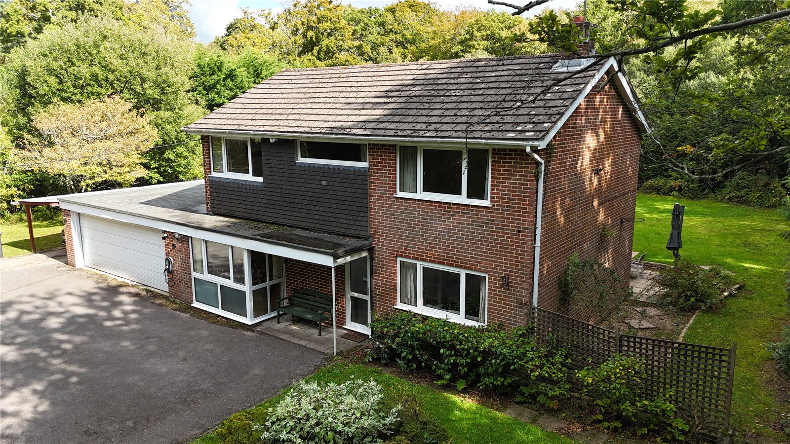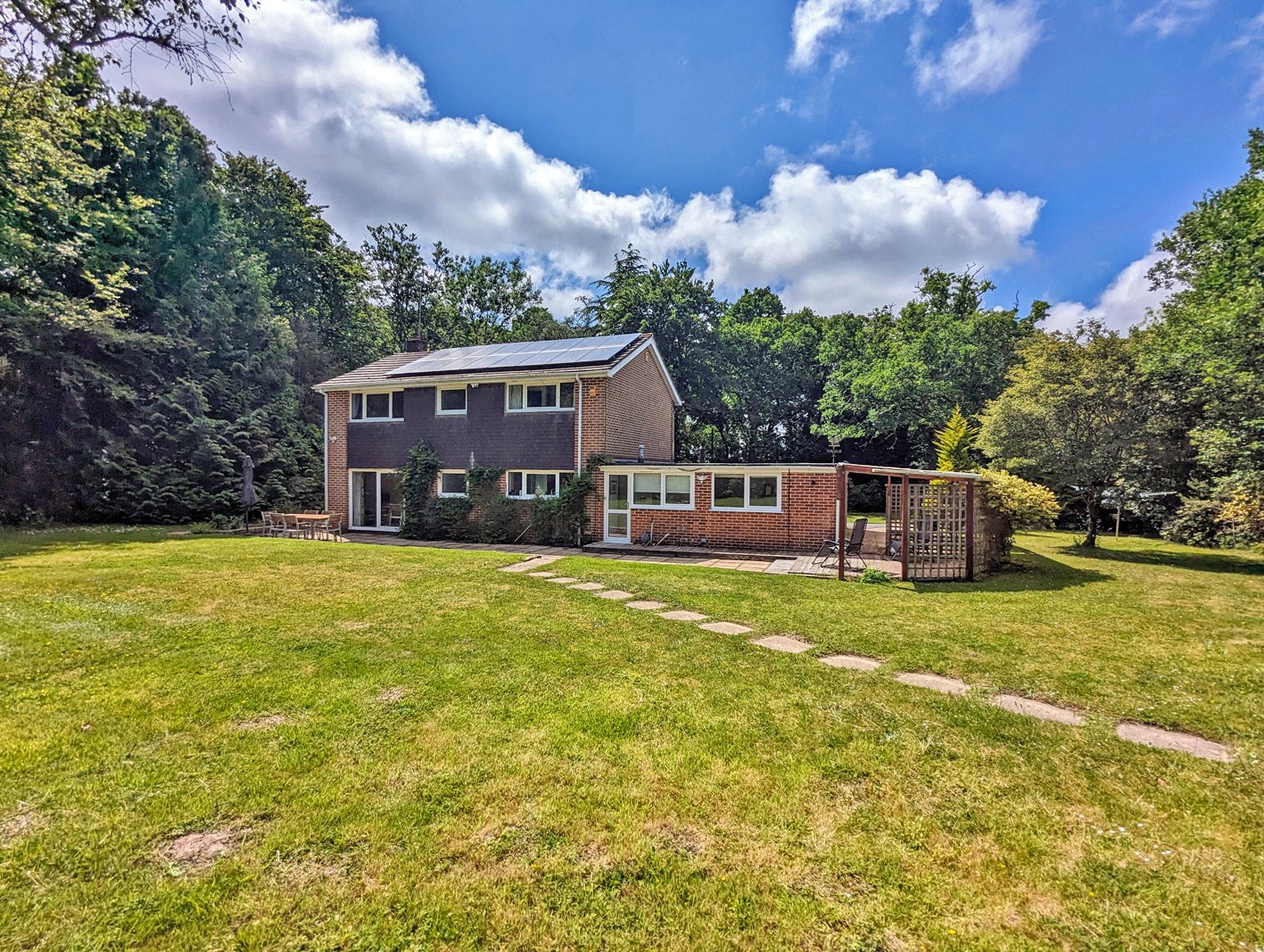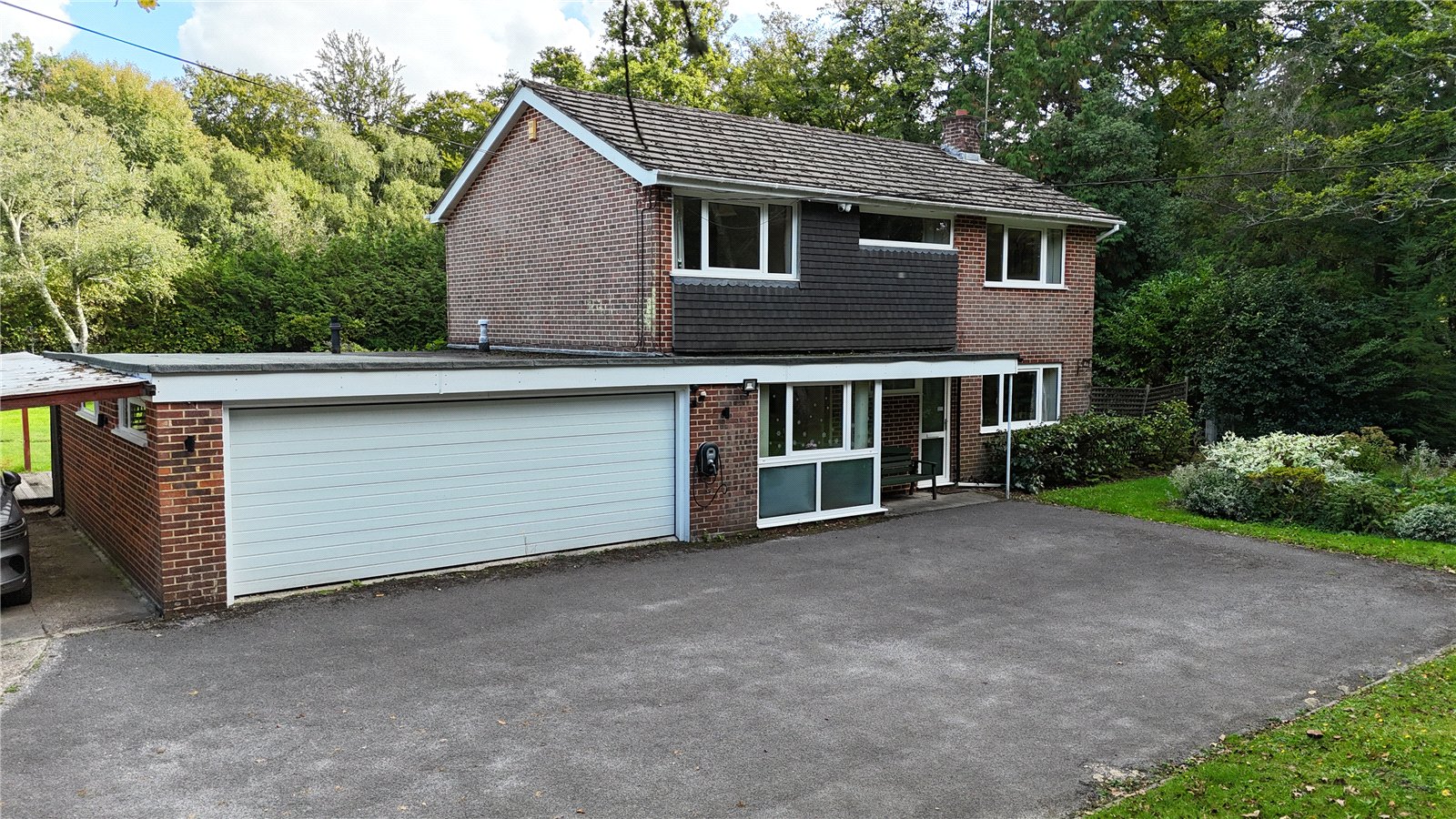 The property sits in a beautifully, secluded setting surrounded by stunning grounds and woodland with south facing aspects to the rear. The property is set back from the road and a five bar gate then opens onto a large drive offering ample off road parking for multiple vehicles and access to the attached double garage.