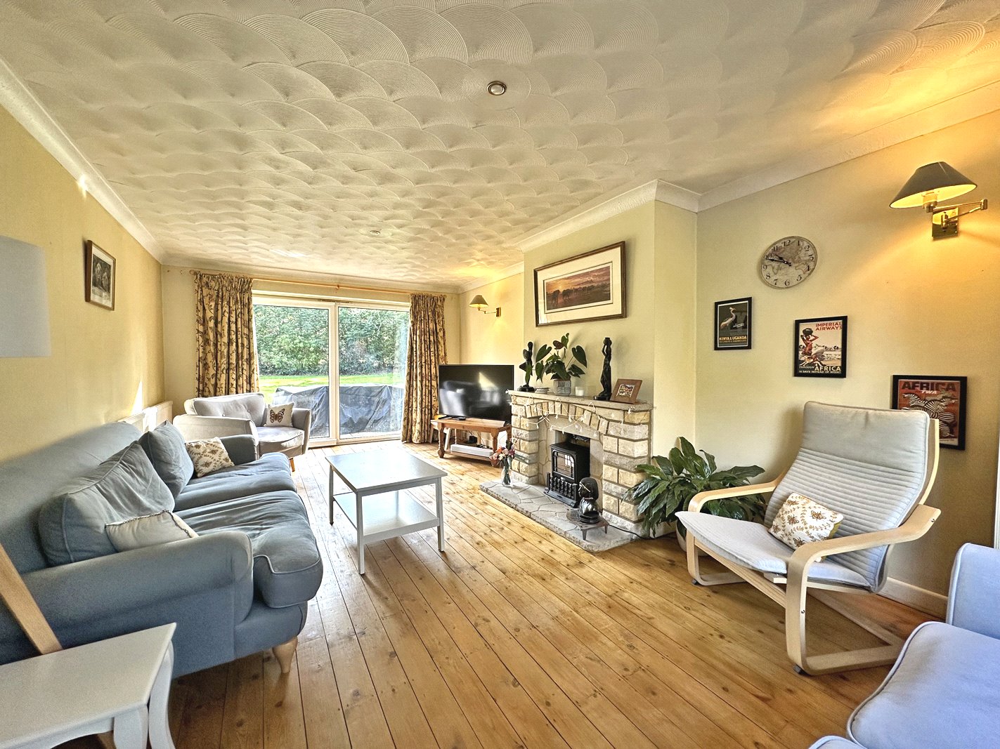 A door to the right hand side leads through to the sitting room with beautiful aspects overlooking front and rear gardens creating a light and bright space. There is a feature fireplace and sliding patio doors opening up to the rear garden.