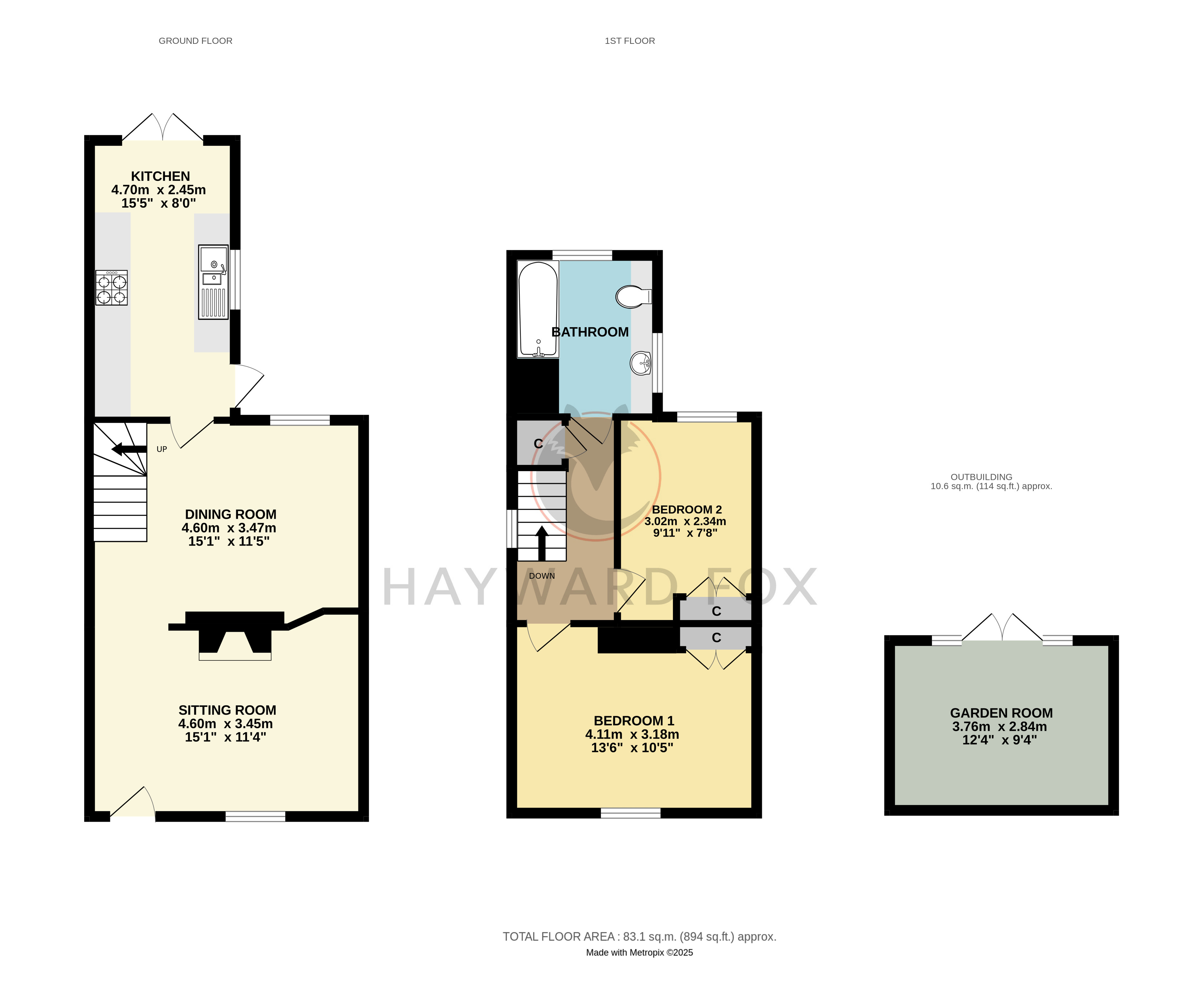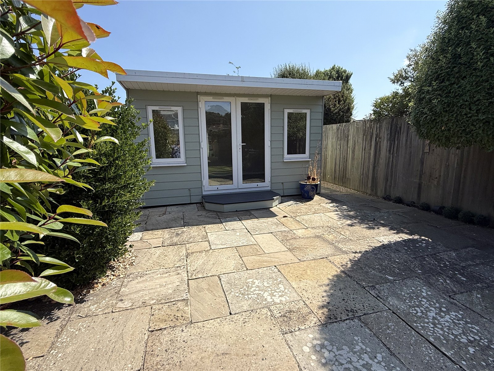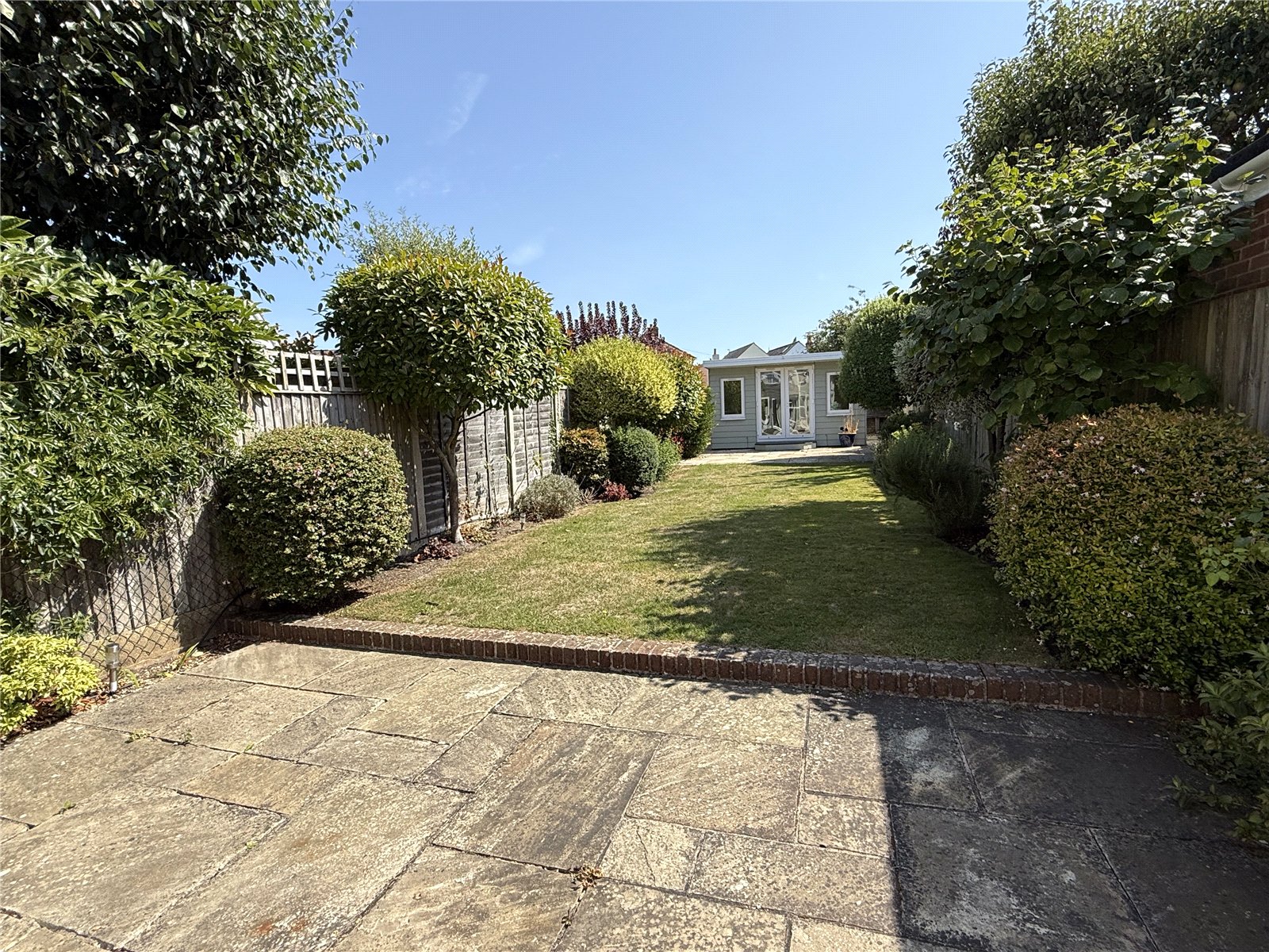 A wrought iron pedestrian gateway leads to a dwarf brick wall onto a paving slab path to the front door as well as continuing to the side of the property giving access to the rear garden. Here we have well enclosed and screened private garden with a large area of patio leading onto a lawn with shrub borders, at the far end a useful Garden Room 12’4 x 9’4 with adjoining patio.