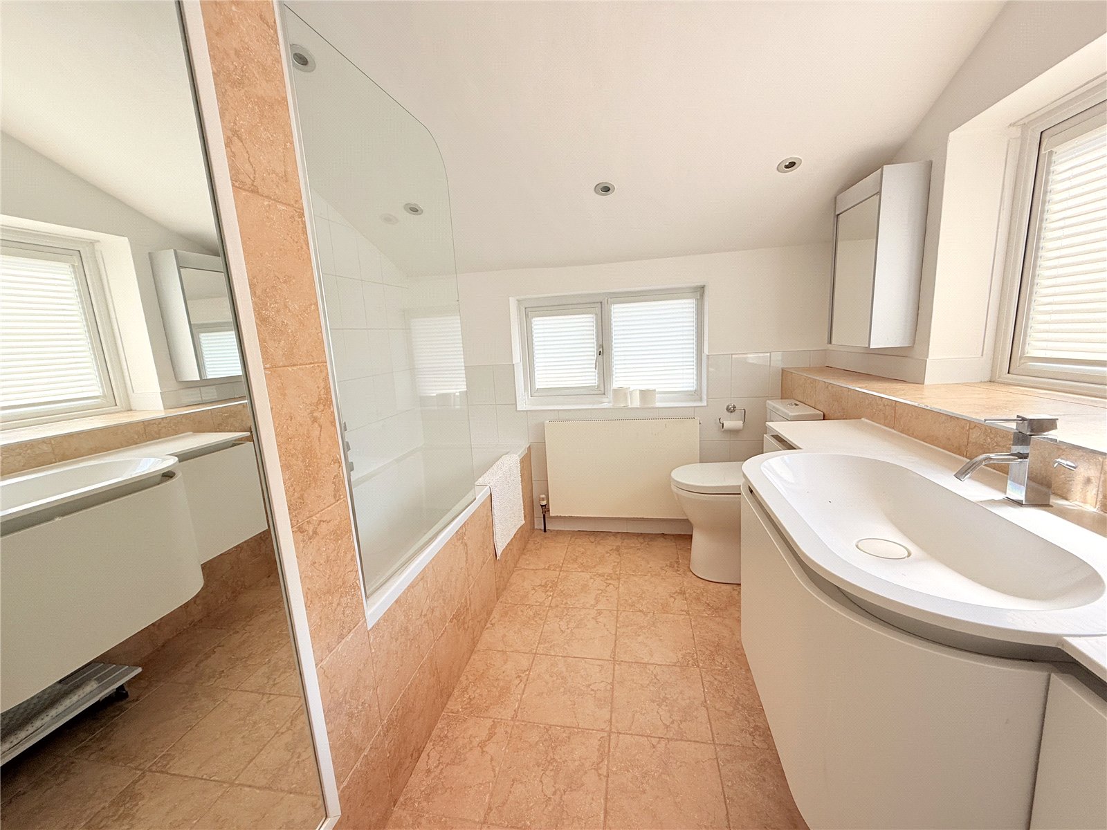 Attractively fitted with modern suite comprising tiled panel bath with separate shower attachment and screen, wc, moulded vanity wash basin with storage cupboard to side and below, heated towel rail, two mirror fronted storage cabinets, large mirror fronted shelved storage cupboard.