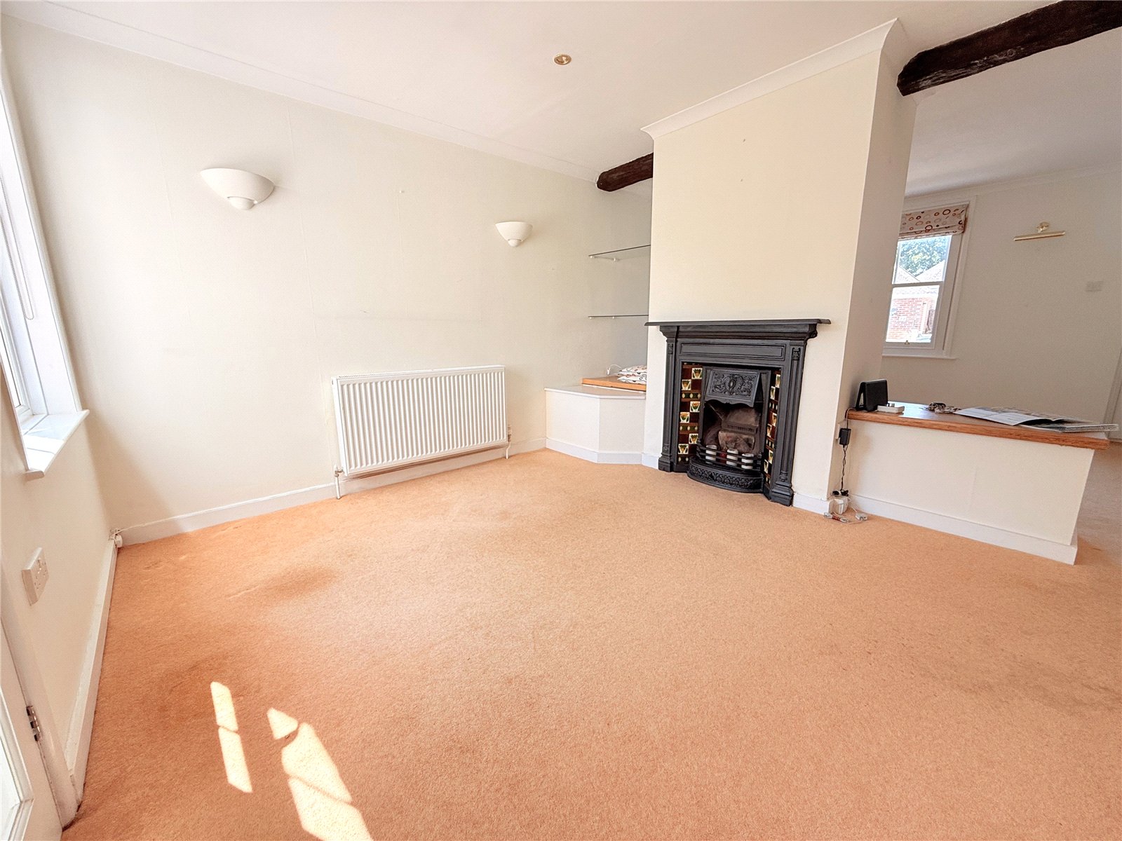 Attractive period fireplace with display shelves to one side and shelving to the other, radiator, opening to