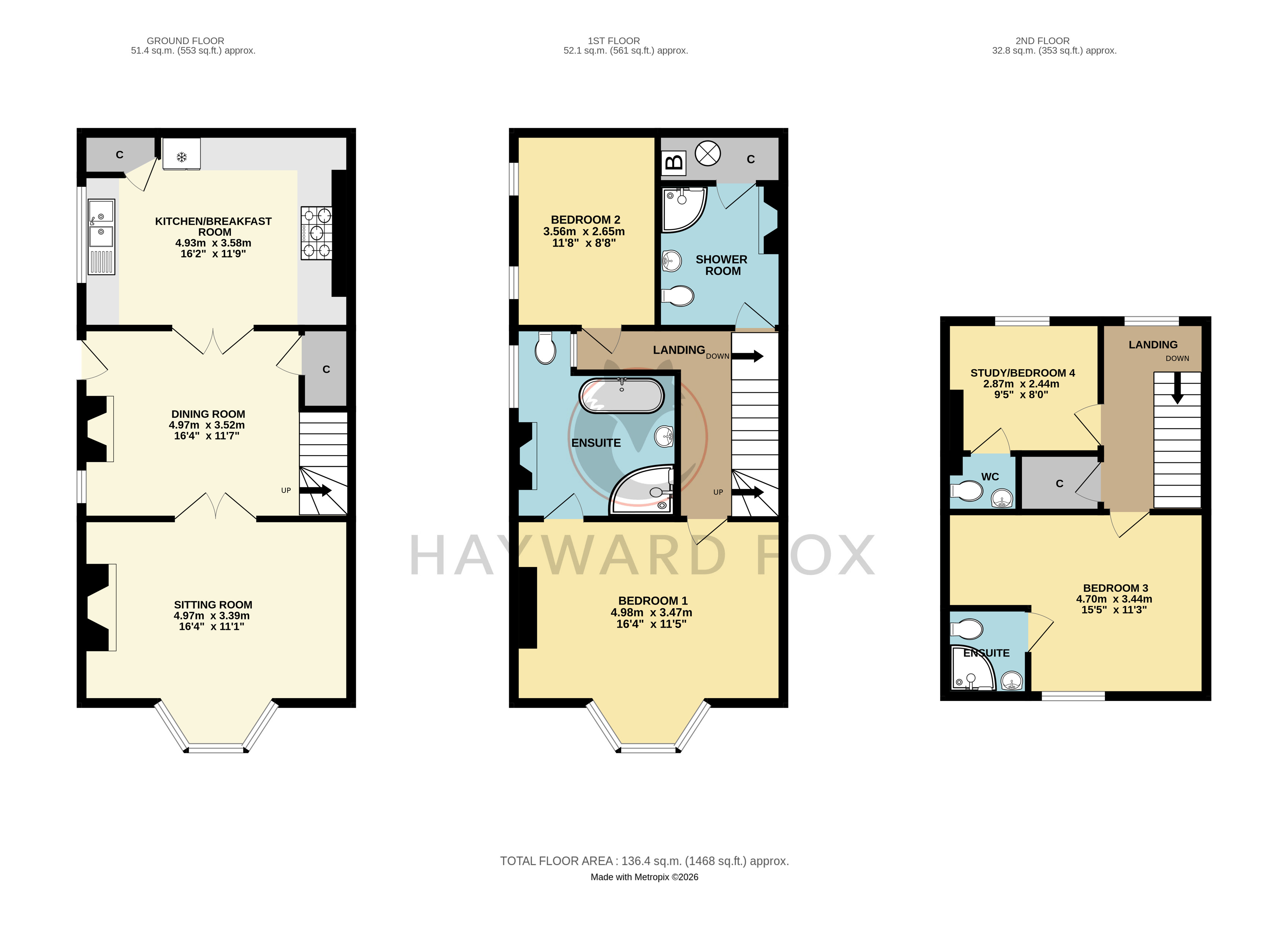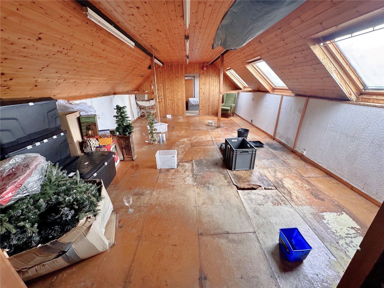 On the second floor, bedroom three is located to the front with its own en-suite shower room, while bedroom four benefits from an en-suite cloakroom. Steps lead to a generous attic space illuminated by two Velux windows, offering further scope and flexibility.