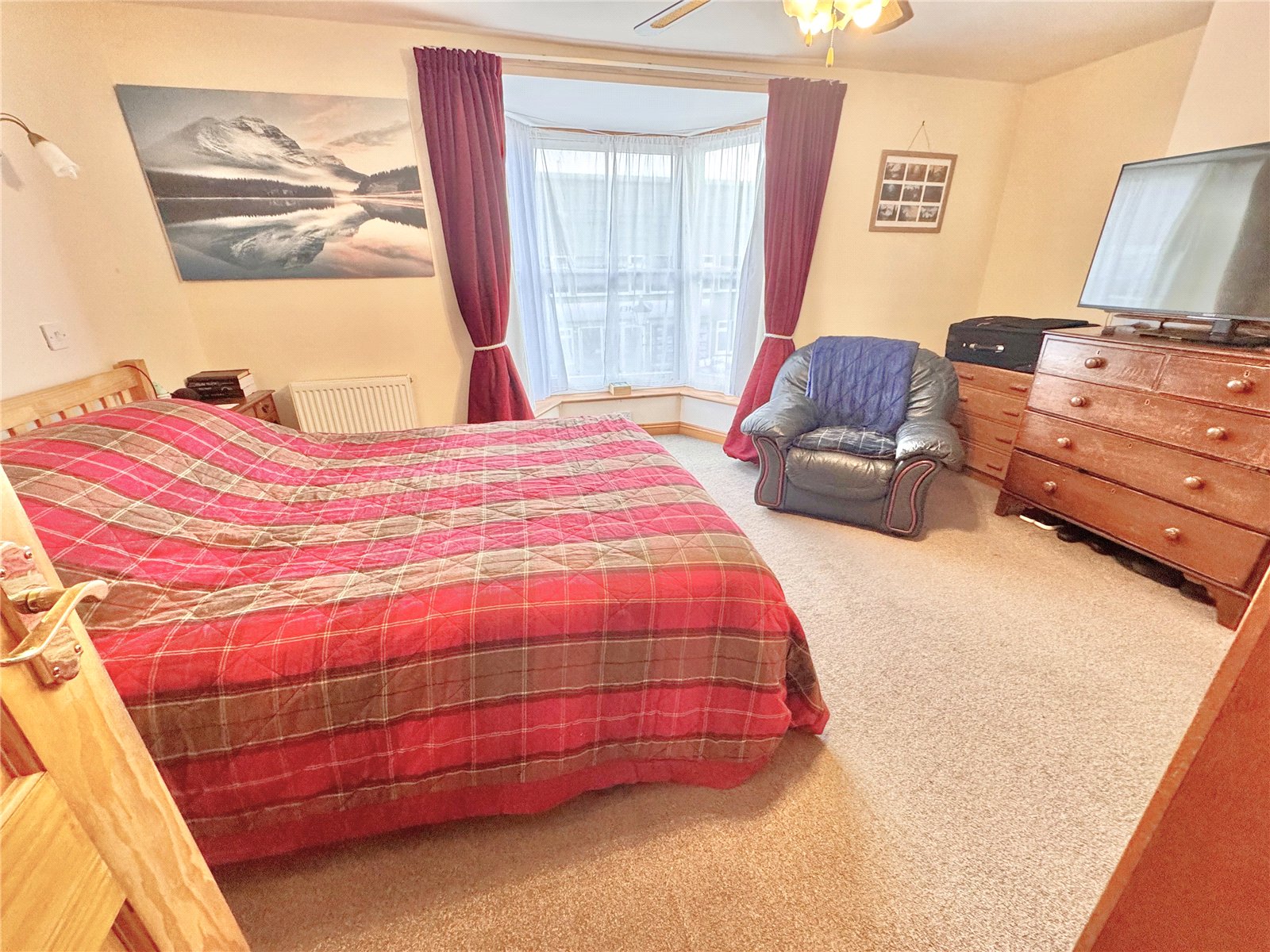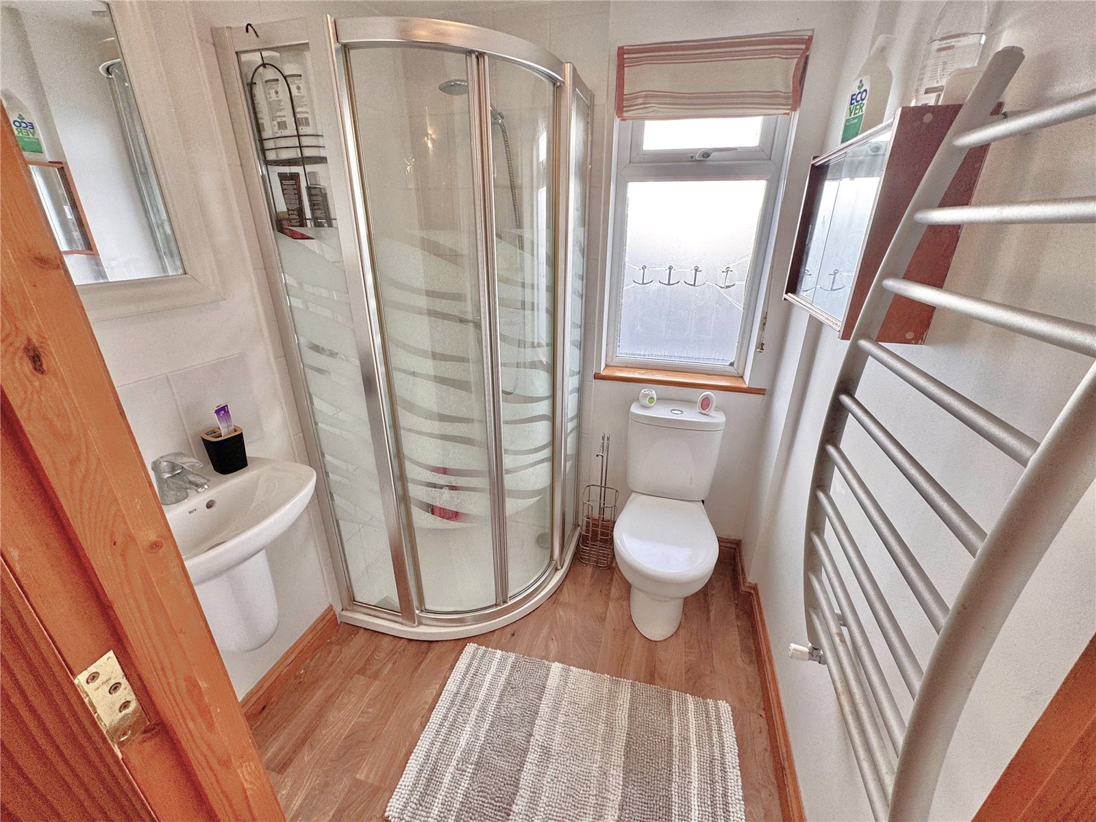 The first floor hosts a principal bedroom to the front, enjoying a bay window and a spacious en-suite bathroom comprising a panelled bath, WC, wash basin, and a large separate shower cubicle, complemented by a charming Victorian fireplace. A second double bedroom is positioned to the rear together with a substantial shower room with WC, wash basin, and a large airing cupboard housing the hot water cylinder and boiler, also featuring a period fireplace.