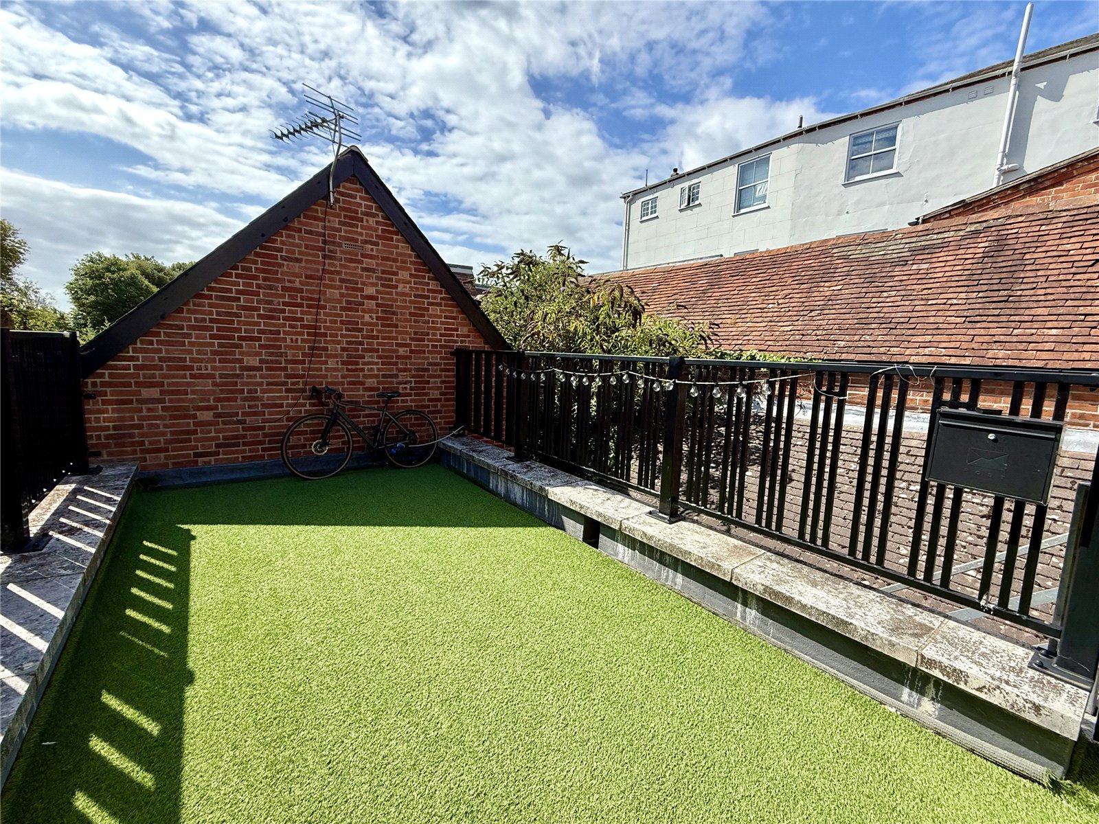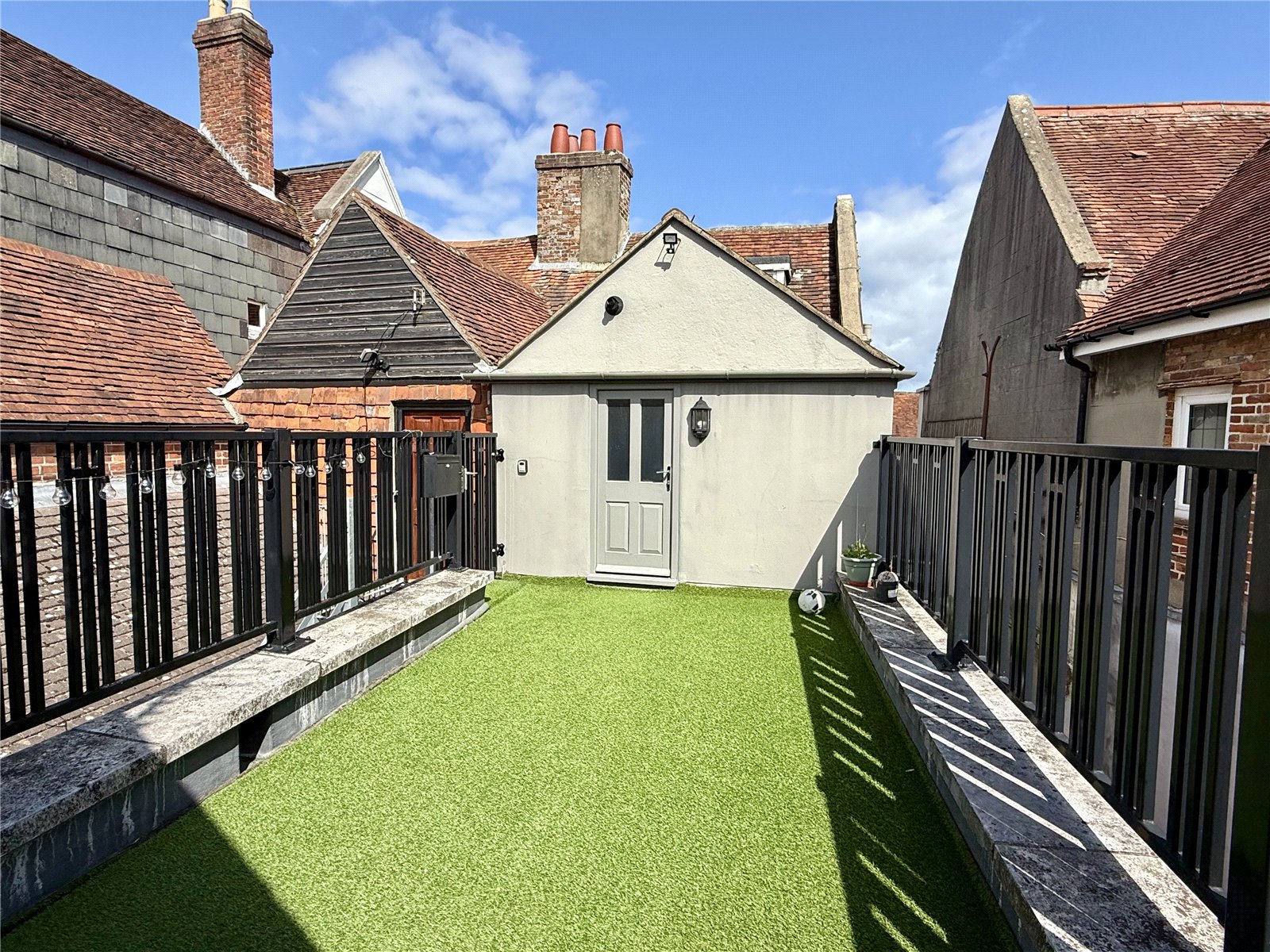 A well enclosed and private roof terrace laid to Astro turf with a gateway to access stairs.