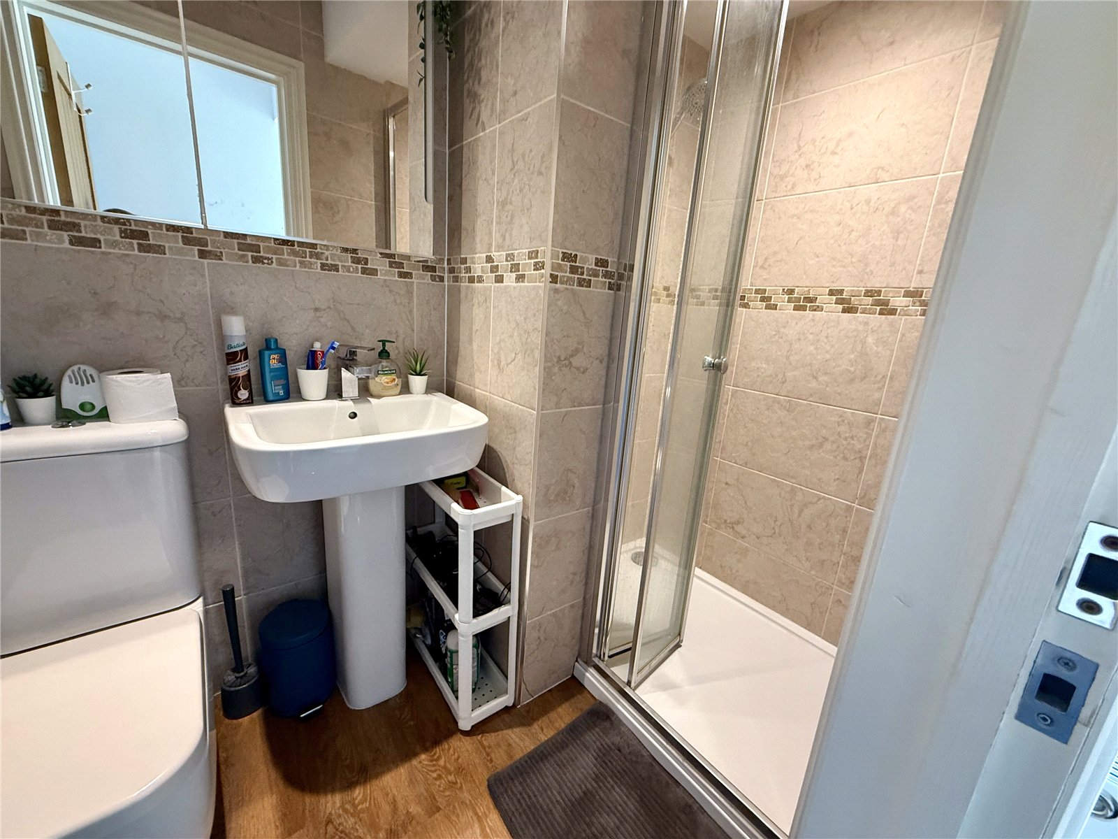 Attractively fitted with tiled shower cubicle with folding screen, wc and wash hand basin, fully tiled walls, wood effect flooring, inset downlighters.