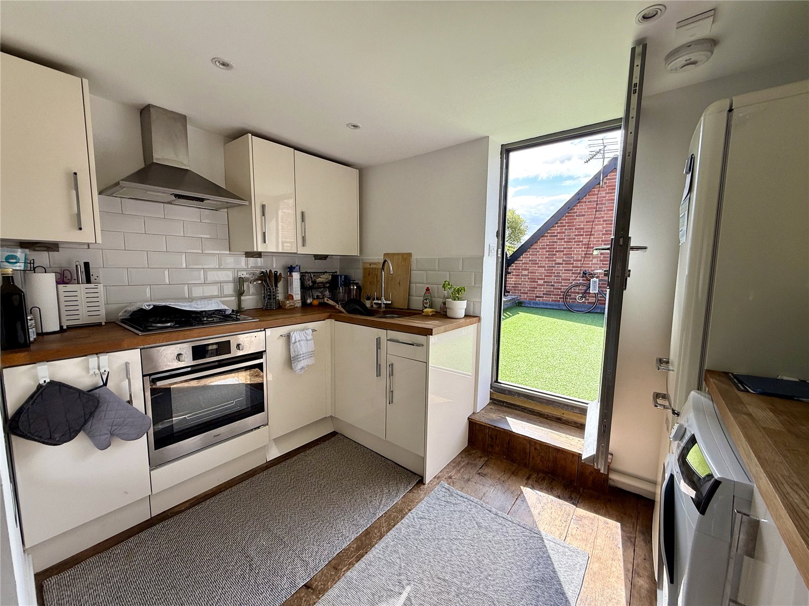 Attractively fitted with wall mounted and floor standing cupboards and drawers with sold wood block work surfaces incorporating a one and quarter bowl single drainer sink with mixer tap, built-in oven with four ring gas hob above and extractor fan over, cupboard housing Alpha gas fired boiler, radiator, stripped wooden flooring, door leading from terrace opening to