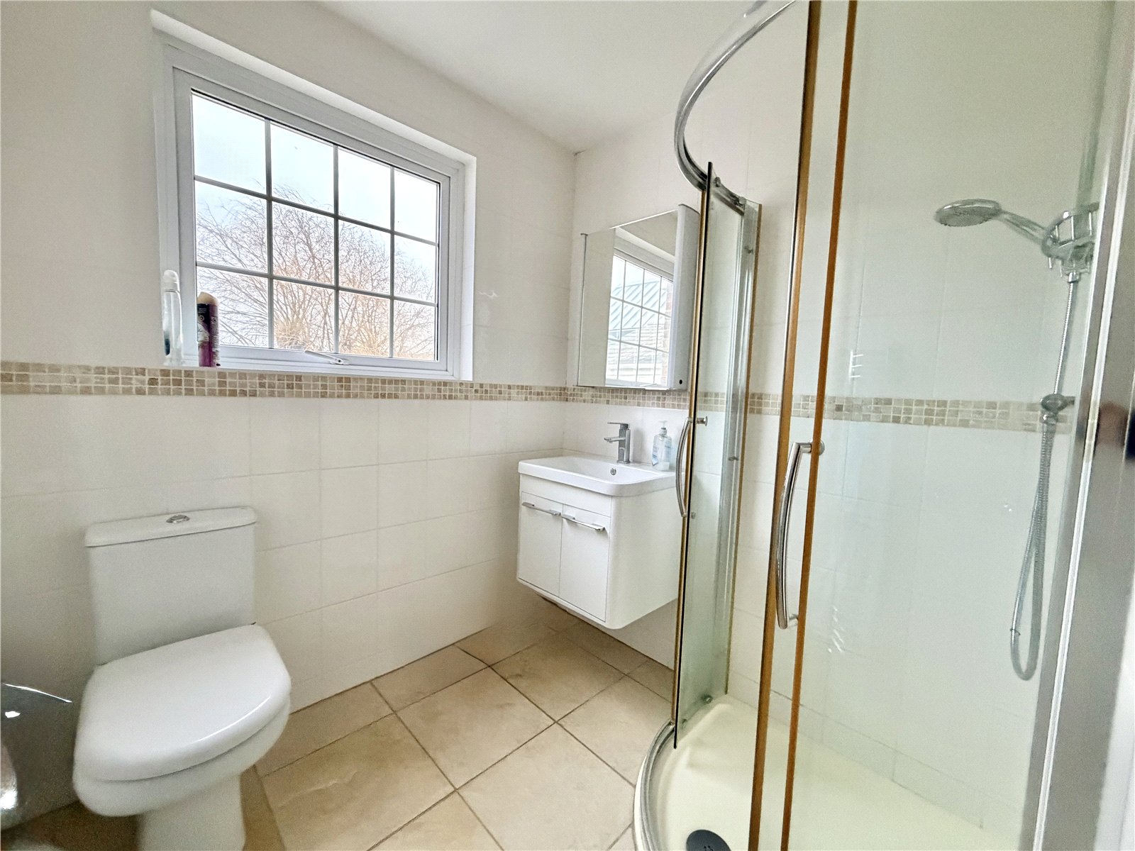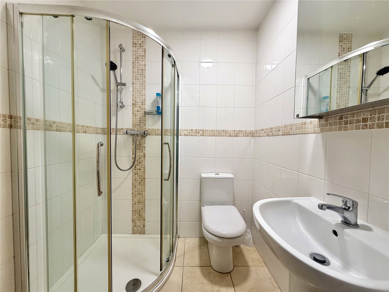 Shower, vanity basin, wc, towel rail, tiled walls.