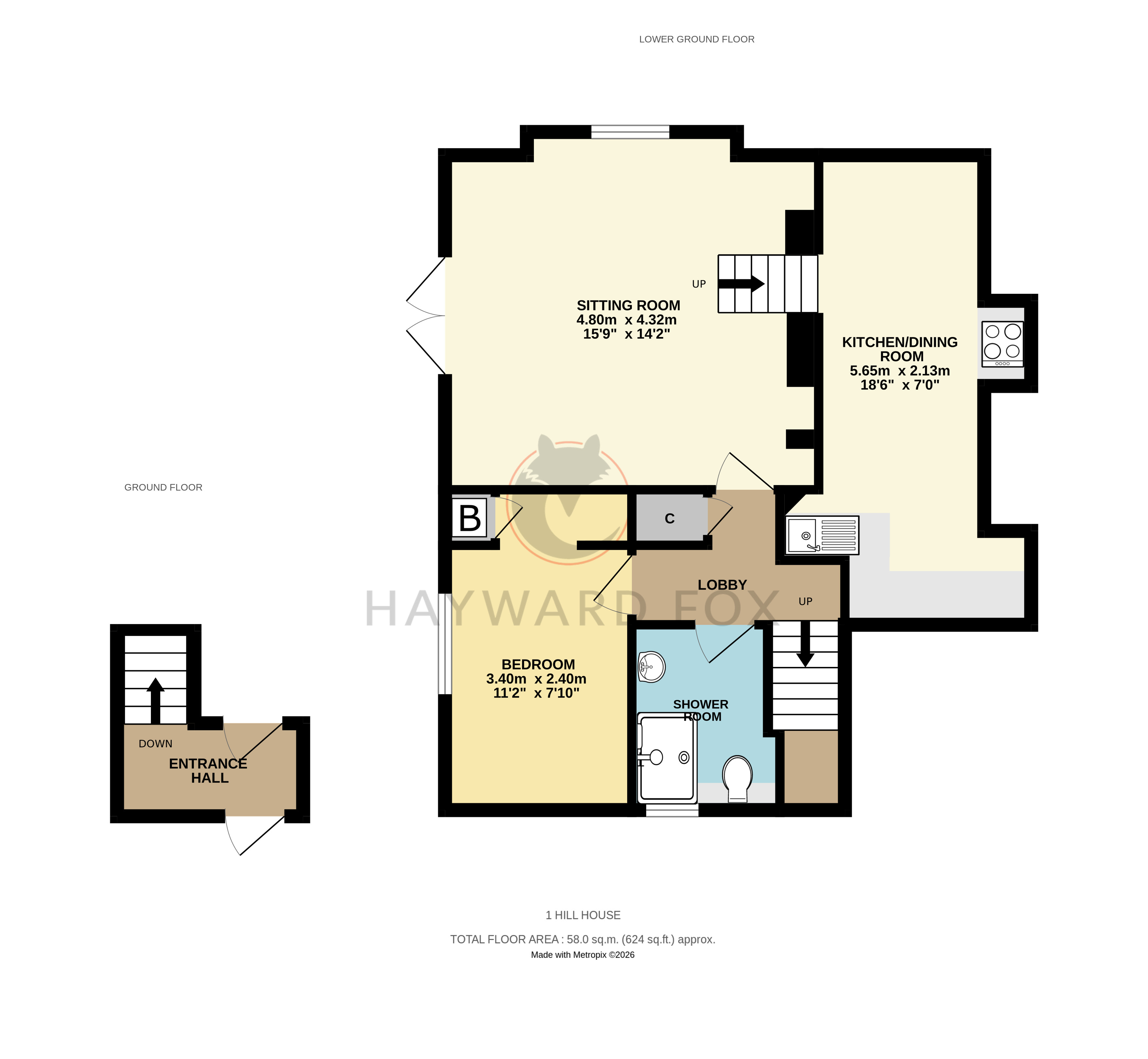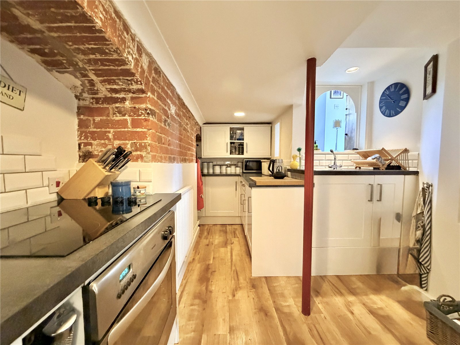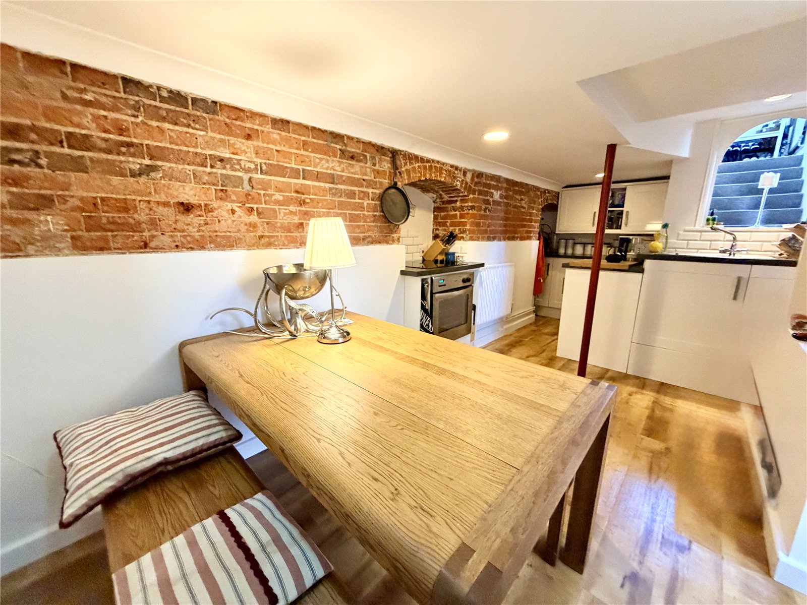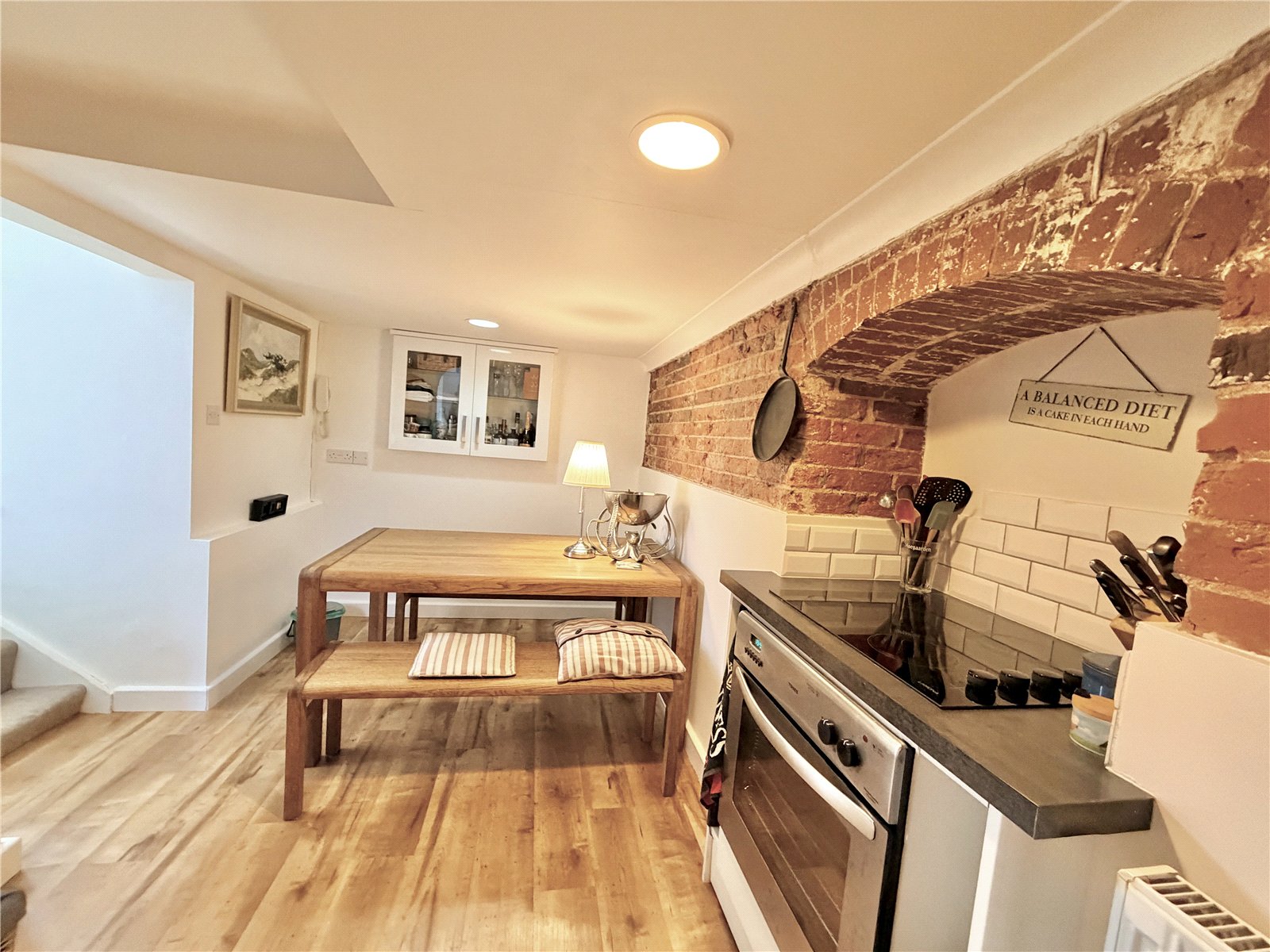 From the sitting room, steps lead down to a lower level where the kitchen/dining room can be found. This characterful space features exposed brickwork and is fitted with a range of cupboards and drawers, incorporating a sink, hob, oven and fridge/freezer.