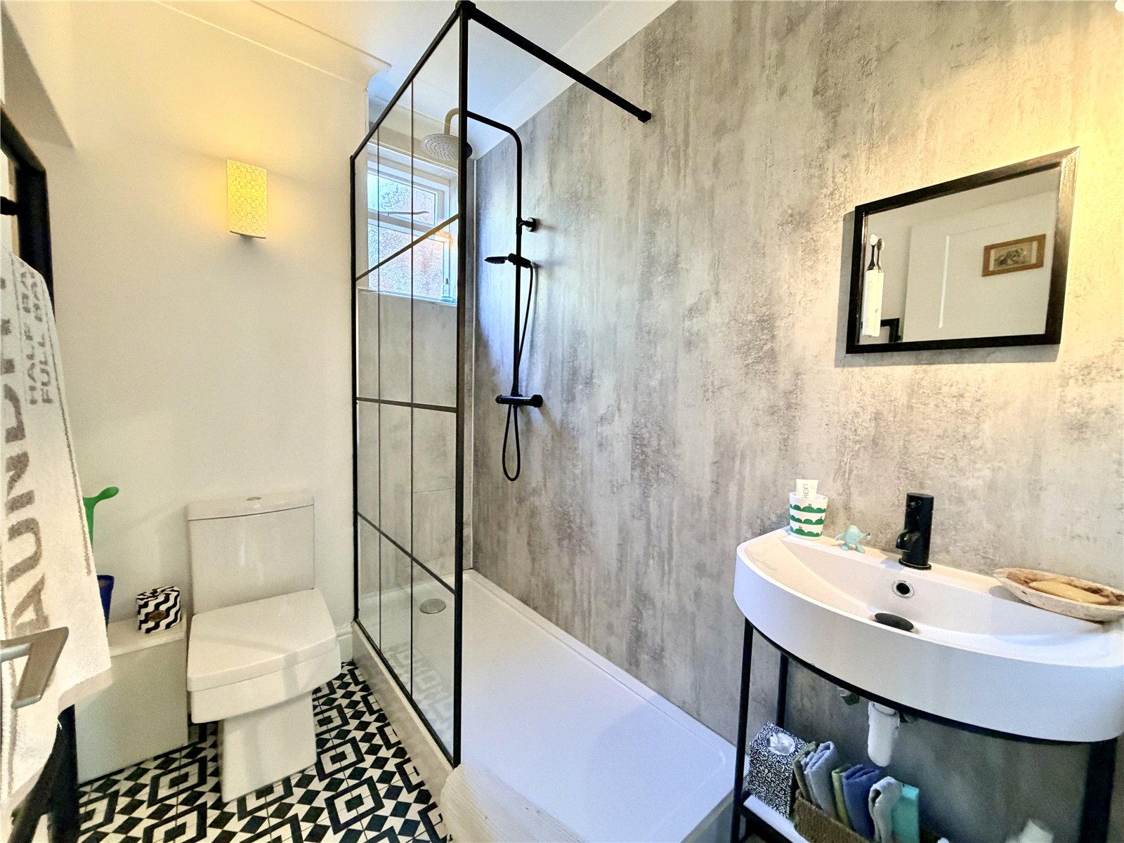 Returning to the inner hallway, the bedroom is well-proportioned and benefits from recessed wardrobe storage and attractive flooring. Adjacent is a recently fitted shower room, comprising a large walk-in shower, WC, wash basin, and heated towel rail, with the added luxury of underfloor heating.