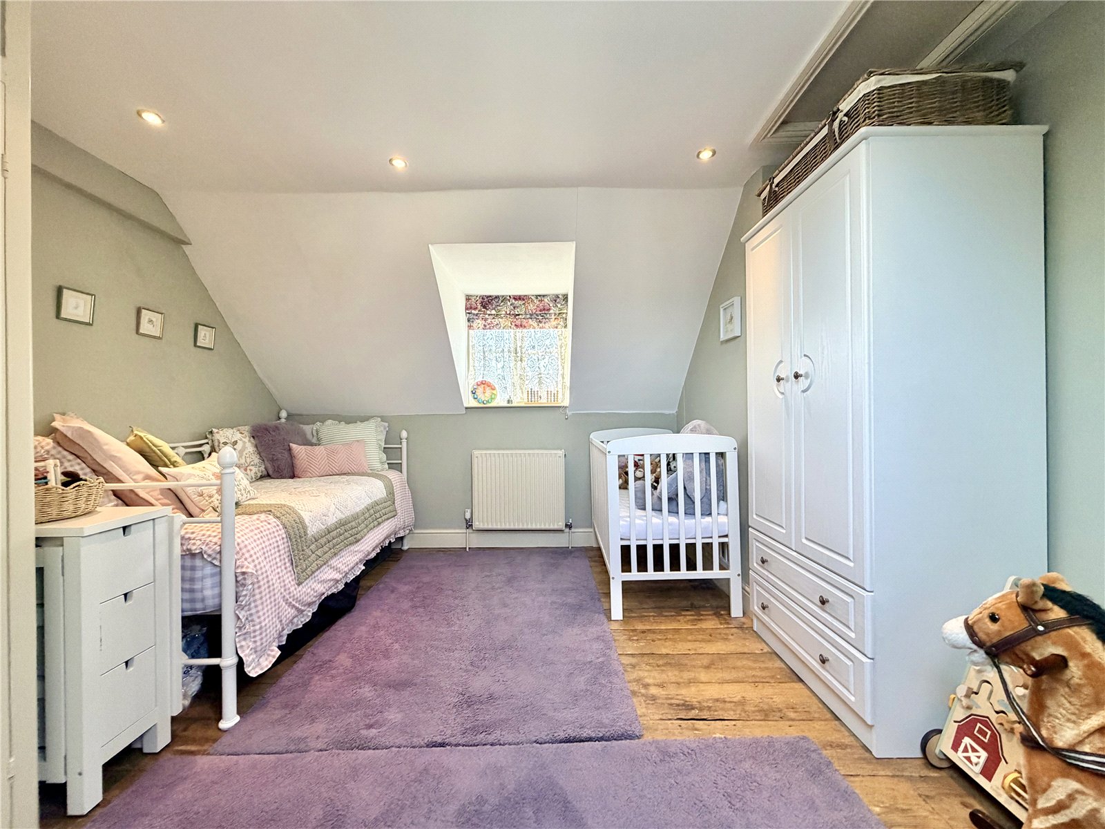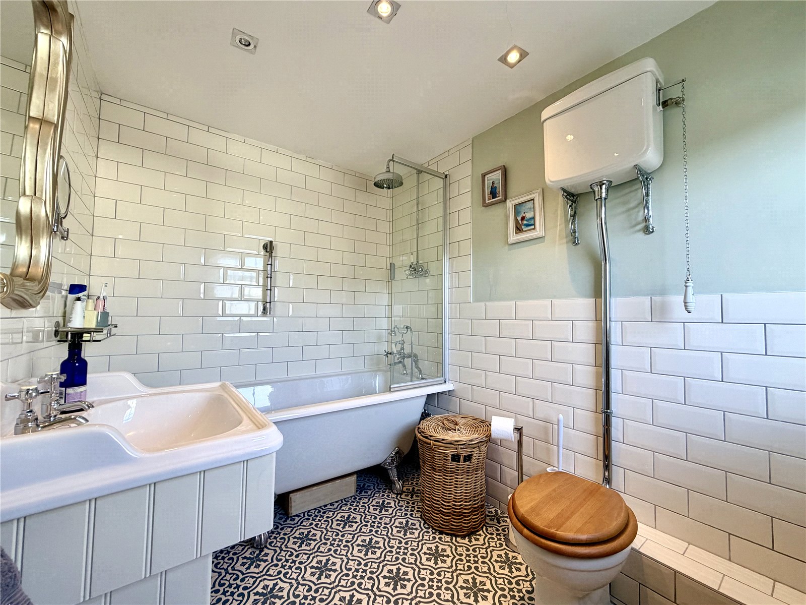 On the first floor the landing has exposed wood panelling leading to a main bedroom with cast iron fireplace with wardrobes and stripped floor. Attractively fitted bathroom with roll top bath with claw feet and shower, vanity basin and high level wc. On the second floor is bedroom two with stripped wood flooring.